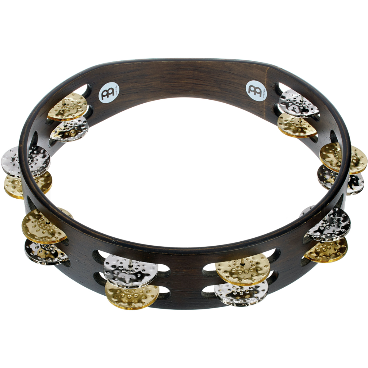 Pandero compacto, diámetro de 10” pulgadas, marco de madera, 2 filas con 8 pares de crótalos de latón martillado y 8 pares de crótalos de acero, ideal para cualquier aplicación en vivo o en estudio.