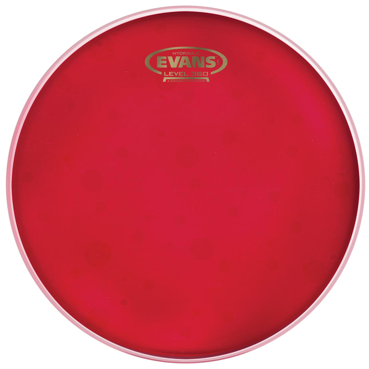 Parche hidráulico de golpe para tom de 12” pulgadas, serie Hydraulic Red, fabricado con 2 capas de película de 7 milésimas de pulgada con aceite entre ellas para eliminar el sustain, gran resistencia y sonido, terminado en color rojo transparente, hecho en USA.