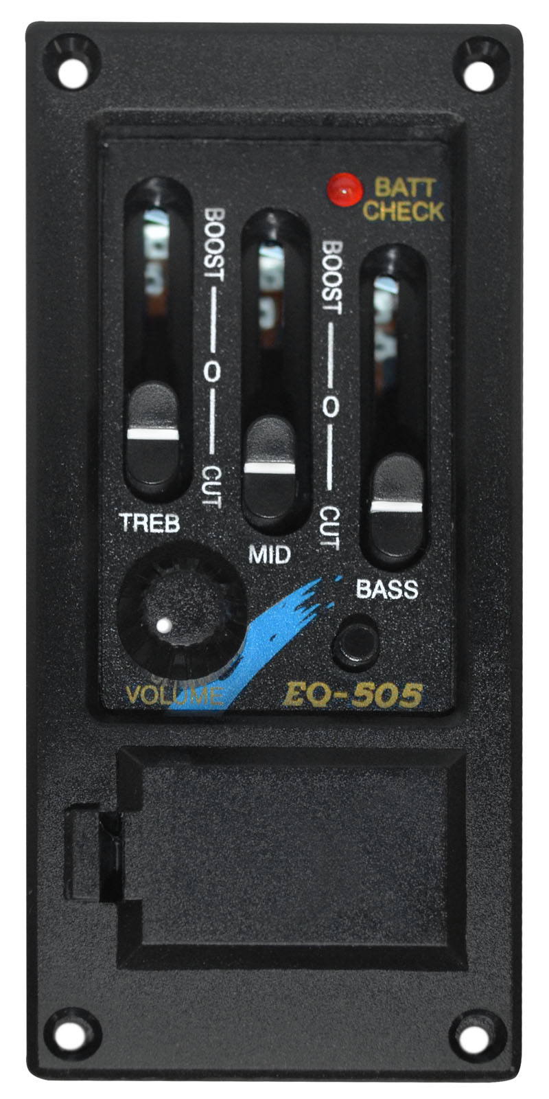 El EQ505 de Belcat es un preamplificador para guitarra Western con un ecualizador que controla graves, medios y agudos (+/- 12 dB cada uno). Cuenta con un rango de frecuencia de 20 Hz – 20 kHz, control de volumen, interruptor de corte de sonido y LED para estado de batería. Incluye pastilla piezoeléctrica y jack endpin.Belcat es una empresa que ha desarrollado una gran línea de productos y accesorios muy bien fabricados, ofreciendo una gran relación en cuanto a precio y calidad. Cuenta con afinadores, audífonos, preamps, combos, metrónomos, pastillas para guitarras eléctricas, acústicas y bajos de gran calidad y precisión.