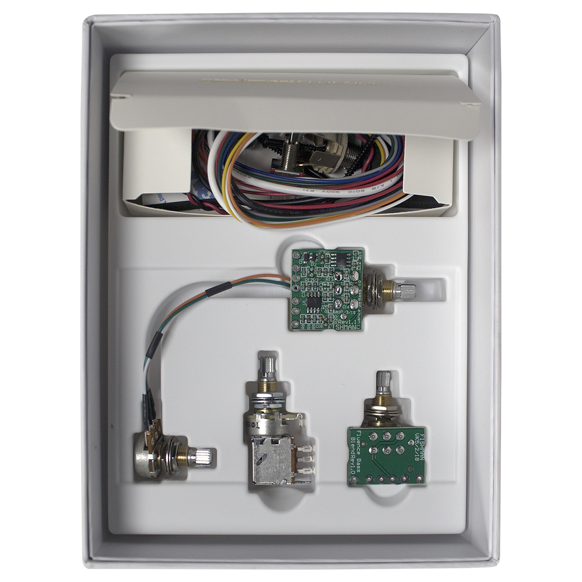 Ecualizador de 2 bandas con agudos/graves independientes.Perilla blend con fácil entrada y salida.Perilla push-pull para división de volumen/coil.Mini switch de palanca de 3 vías para una fácil selección de voz.Todos los components necesarios para logar el esquema de cableado de Fluence Bass.