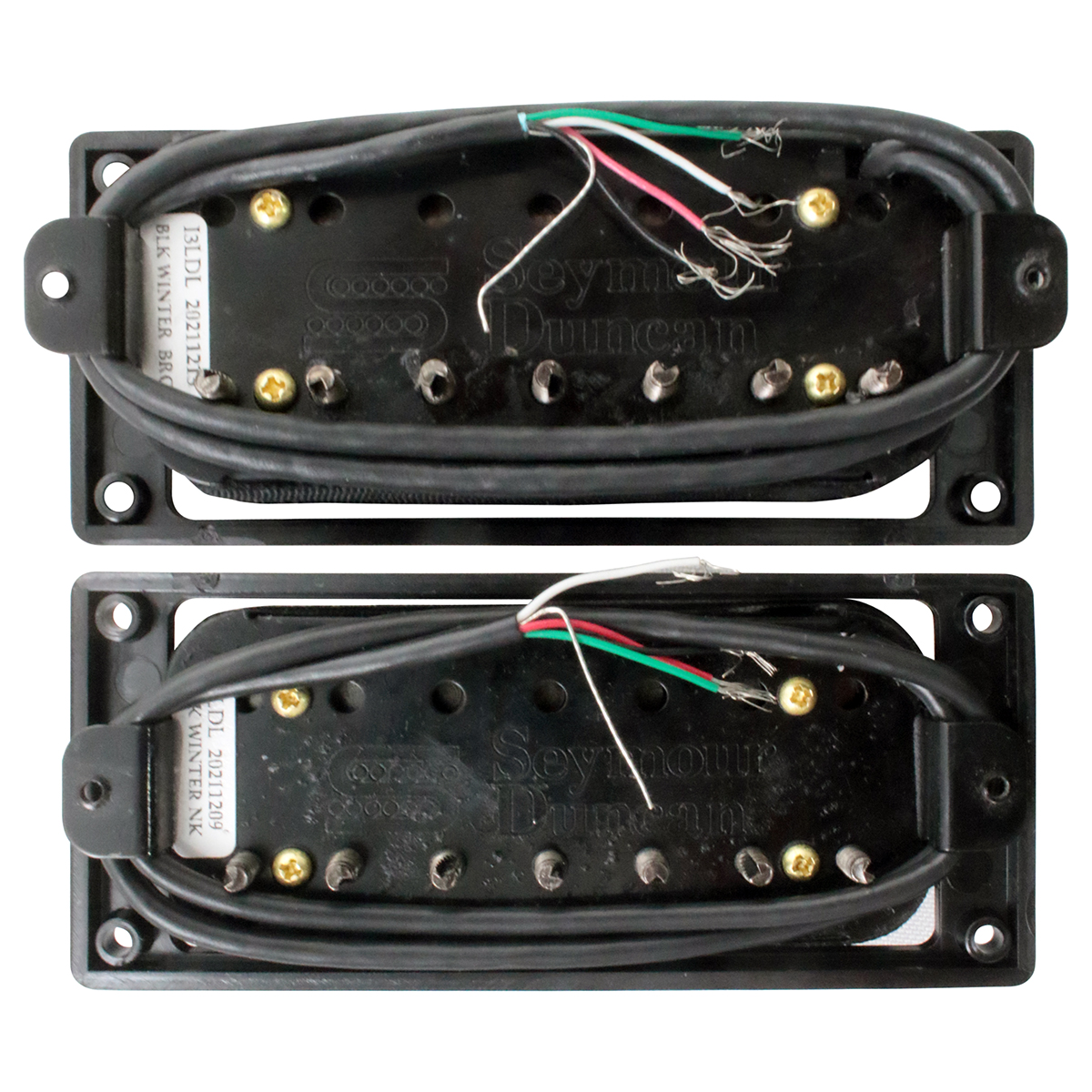 Set de pastillas humbuckers pasivas para guitarra eléctrica de 7 cuerdas, modelo Black Winter, posición: puente y brazo, cableado: 4 cables blindado, imán: cerámica, resistencia brazo: 16 kilo-ohms, resistencia puente: 20.4 kilo-ohms, pastillas despiadadas creadas para Black Metal, Death Metal o cualquier otro estilo extremo más gélido, tan brutal como el invierno escandinavo.