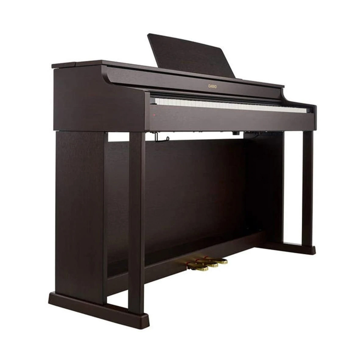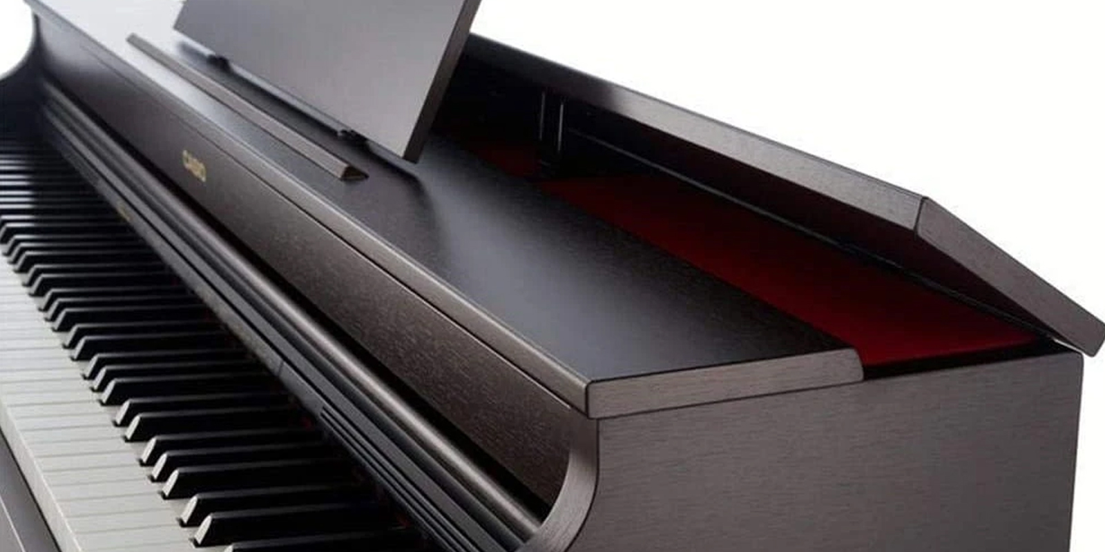 Banco de altura ajustable, adaptador AC (AD-E24250LW), atril de partituras y gancho para audífonos.