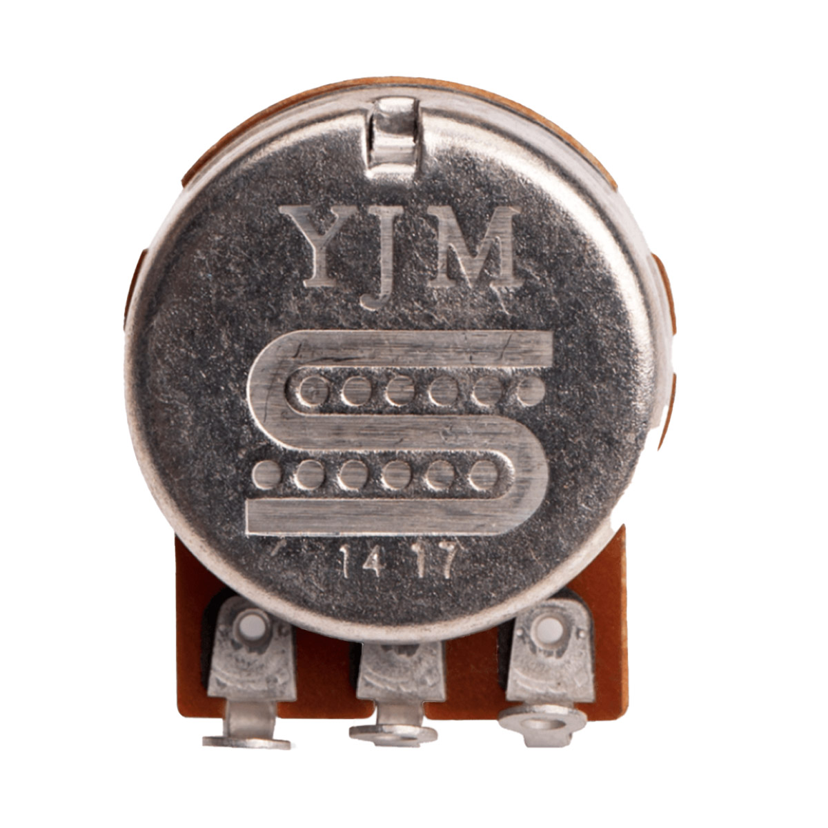 Potenciómetro de volumen de alta velocidad YJM es un potenciómetro bourns de alta calidad de 250k. Diseño de eje dividido del poste puede acomodar una variedad de perillas. Esta es la versión de 250k Ohm, y se usa mejor con YJM Fury Stacks, o pastillas Stratocaster de bobina simple verdaderas. Viene con hardware de montaje.