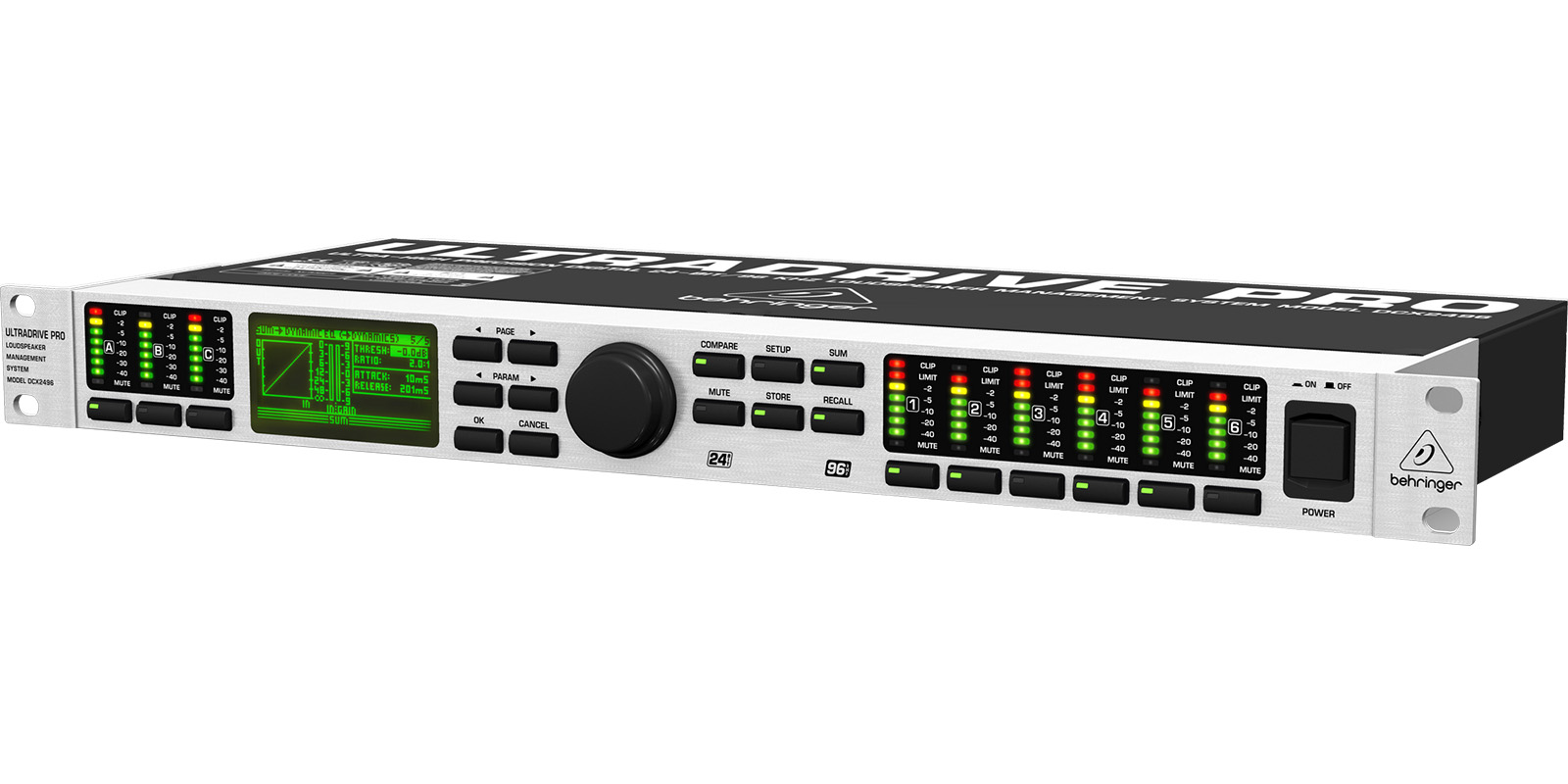 Frecuencia de muestreo: 96 kHz.Retraso de señal: <1 ms entrada análoga a salida análoga.Respuesta de frecuencia: 10 Hz a 45 kHz (-3 dB) típico.Rango dinámico: 112 dB.Relación THD+N: 0,007% @ 0dBu / 0,004% @ 10 dBu.
