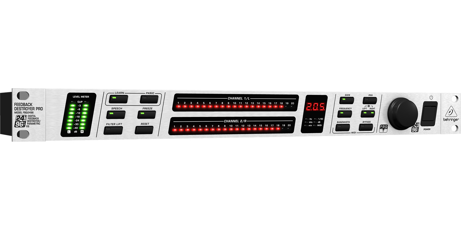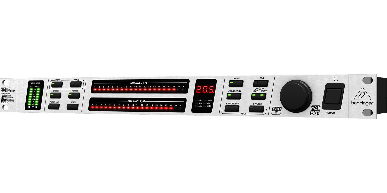 Tipo: Análisis de señal digital para propósitos de reconocimiento de retroalimentación.Filtro: Máximo 20 filtros digitales de muesca por canal.Rango de frecuencia: 20 Hz a 20 kHz.Ancho de banda: 1/60 octava.Posible valor de rango: 0 a -36 dB.