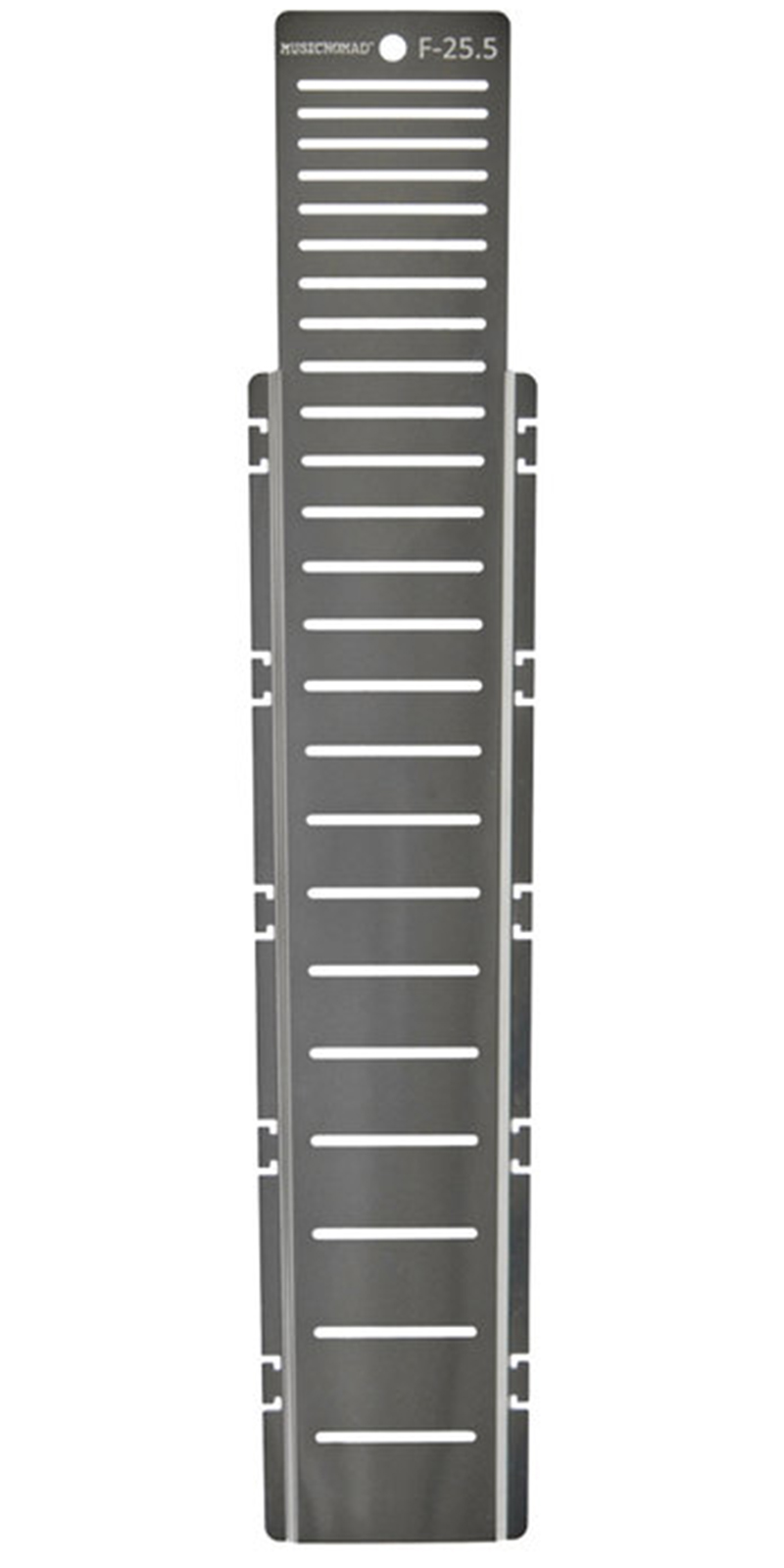 Fret Shield brinda protección total del diapasón cuando realiza trabajos de traste como pulir, nivelar y coronar en una escala de trastes de guitarra de 25,5” hasta 24 trastes. Diseño de acero inoxidable de alta calidad con grosor de 0,008” (0,20 mm). El diseño cónico tiene tamaños de ranura que miden desde el primer traste 0,125” (3,18 mm) de ancho x 2,075” (52,715 mm) de largo hasta el último traste 0,125” (3,18 mm) de ancho x 2,516” (63,916 mm) de largo y se adapta a todos los tamaños de traste (desde estrecho a jumbo) que se encuentran en guitarras de 6 cuerdas.Los bordes desplegables formados permiten que las bandas de goma que incluimos mantengan el Fret Shield en su lugar de forma segura y mantengan las bandas debajo de la superficie superior para evitar dañarlas durante el proceso de pulido.