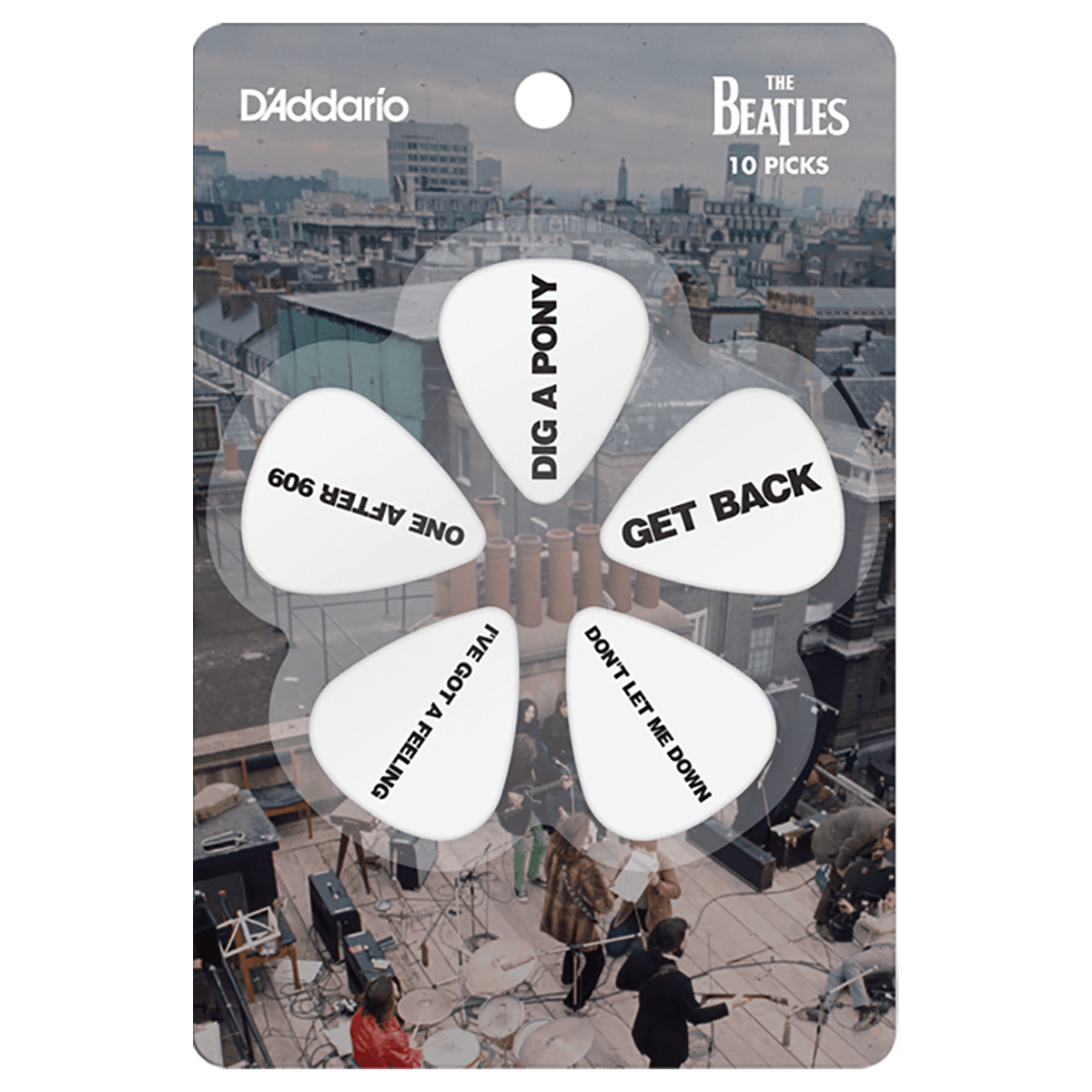 En un frío día de enero de 1969, The Beatles subieron al techo de Apple Corps en Londres para lo que sería su último show público. La banda deleitó a los espectadores con un conjunto icónico de cinco clásicas canciones. Ahora estamos conmemorando este improvisado concierto con esta serie de púas de guitarra, inspiradas en esa lista final de canciones.