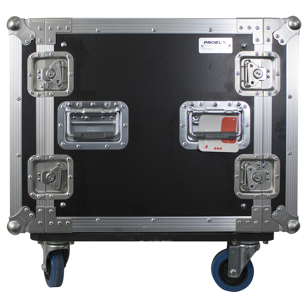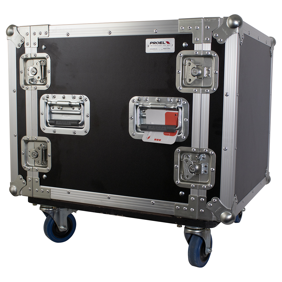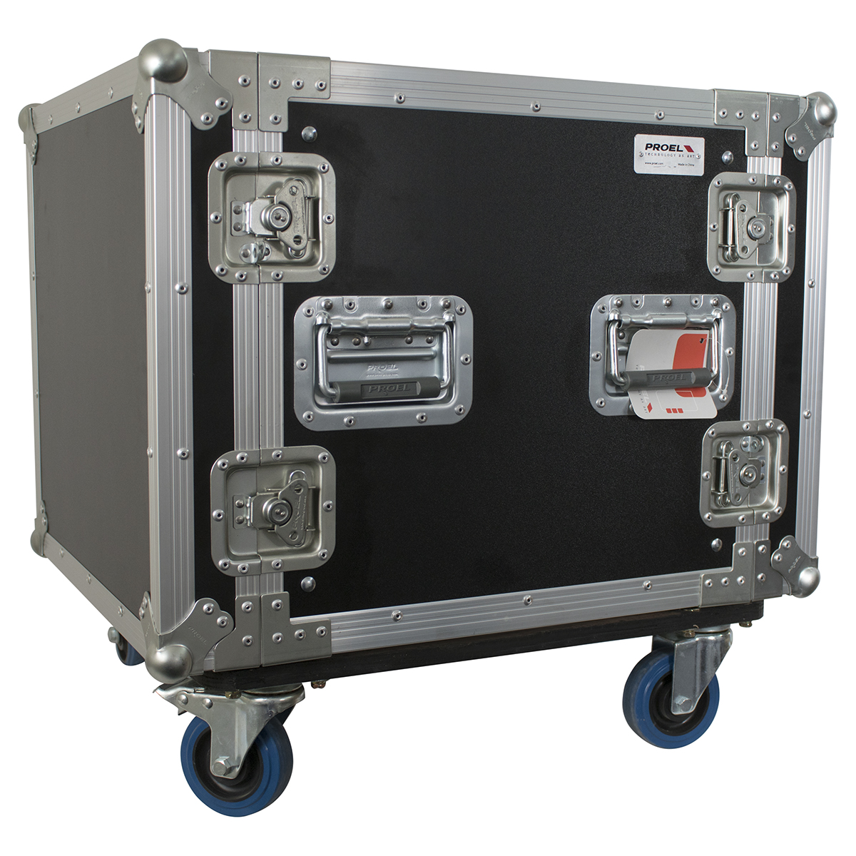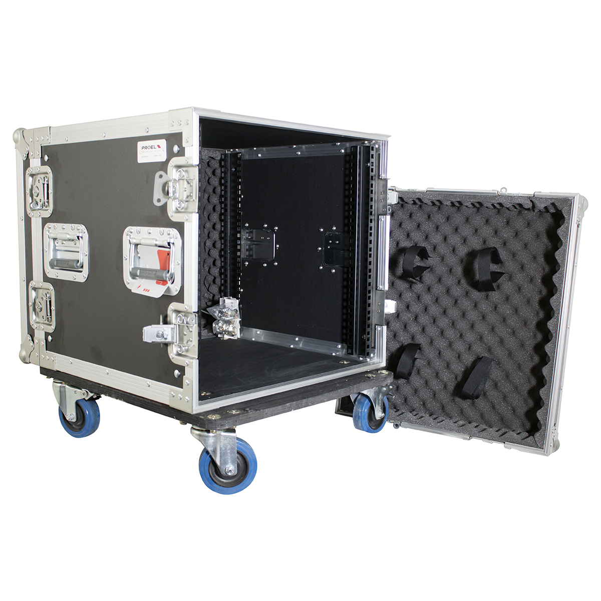 Estuche de rack profesional de 19″ pulgadas para 10 unidades con 4 ruedas de 100 mm de grado industrial (2 con freno).