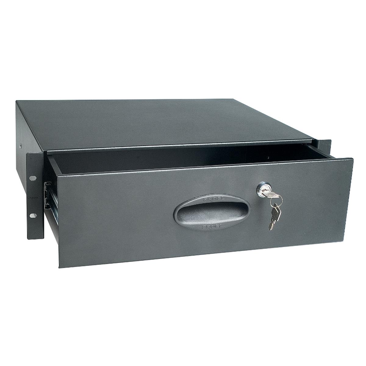 Cajón metálico Proel con llave.Para 3 unidades de rack.Color negro.
