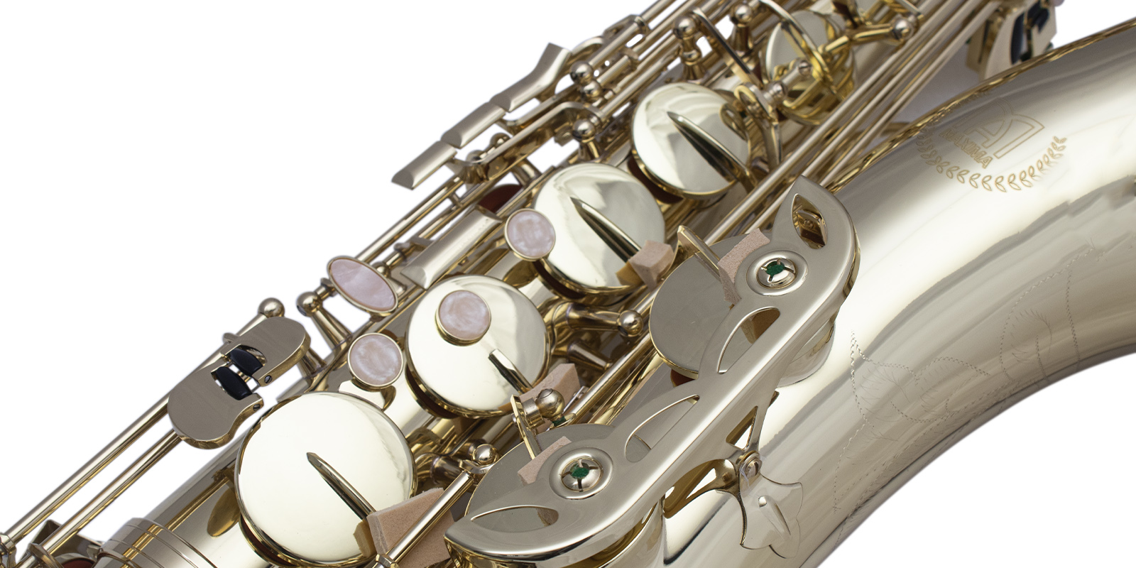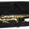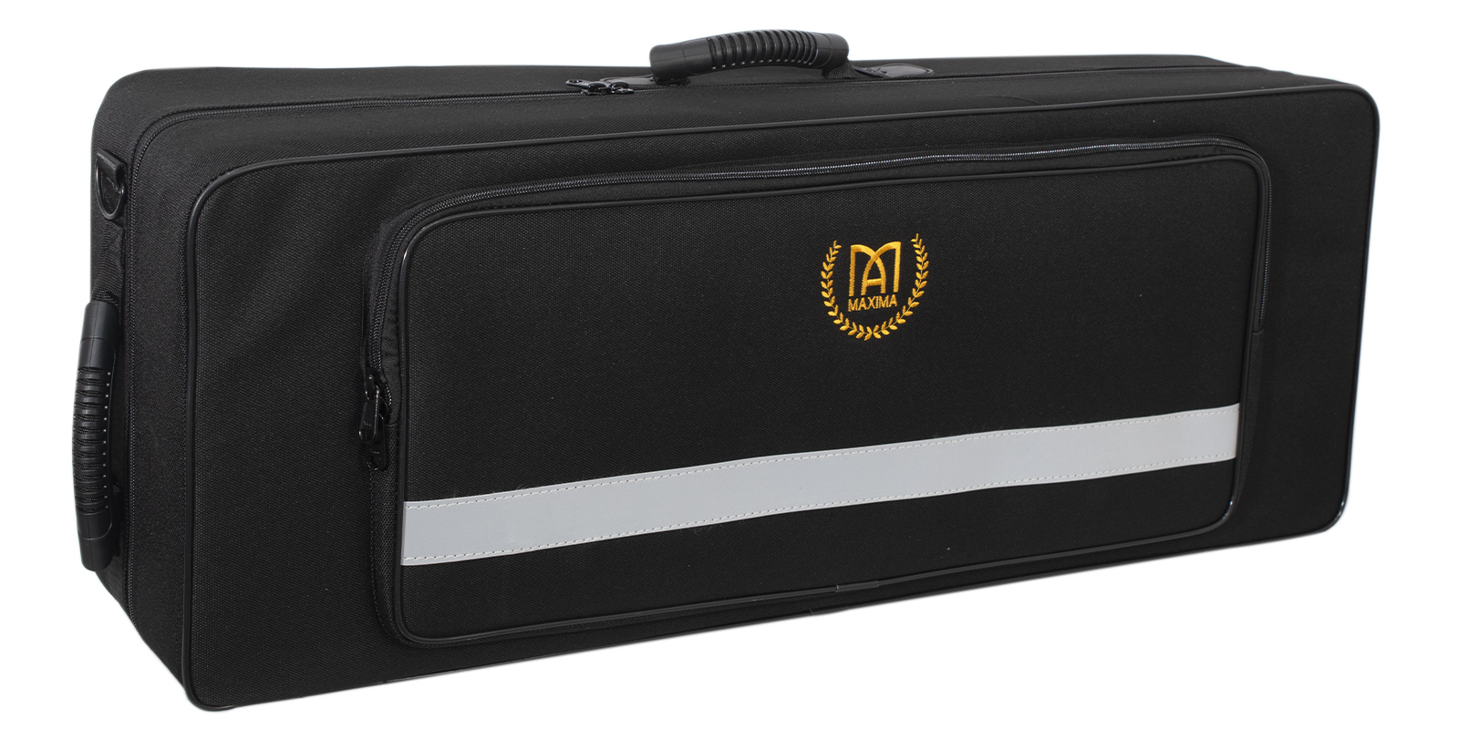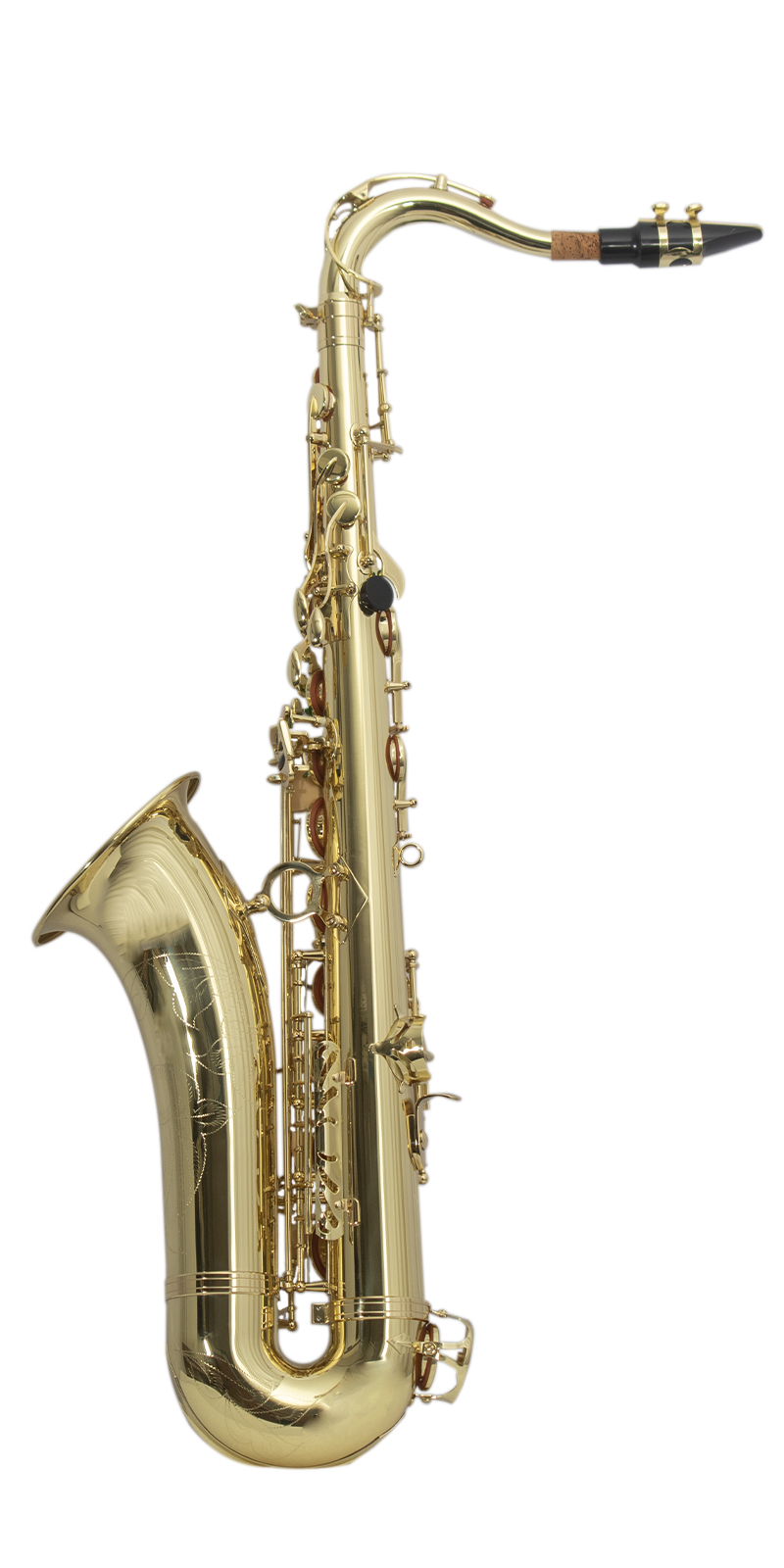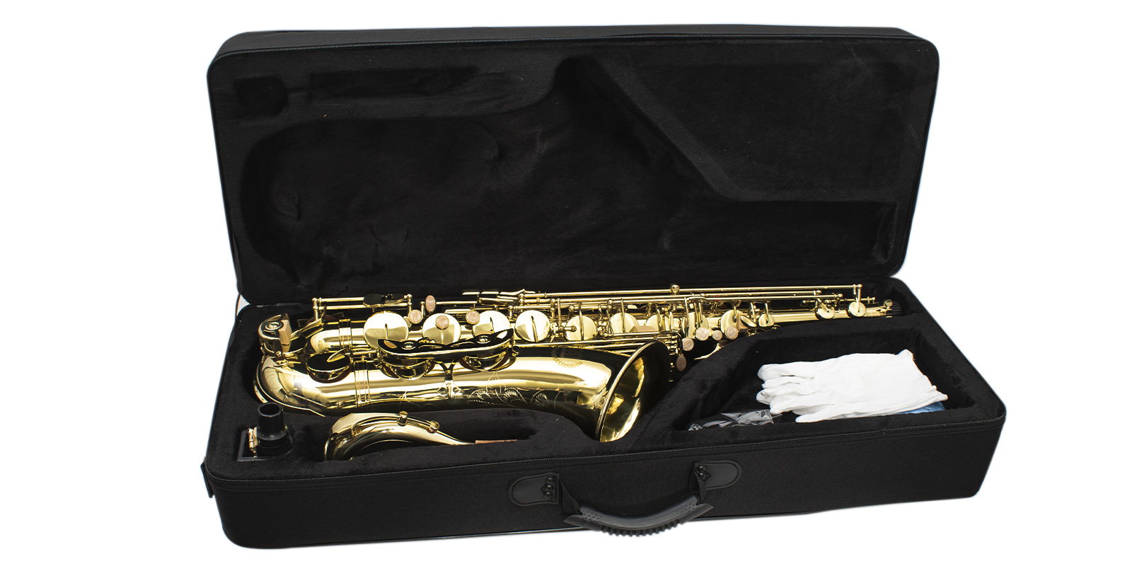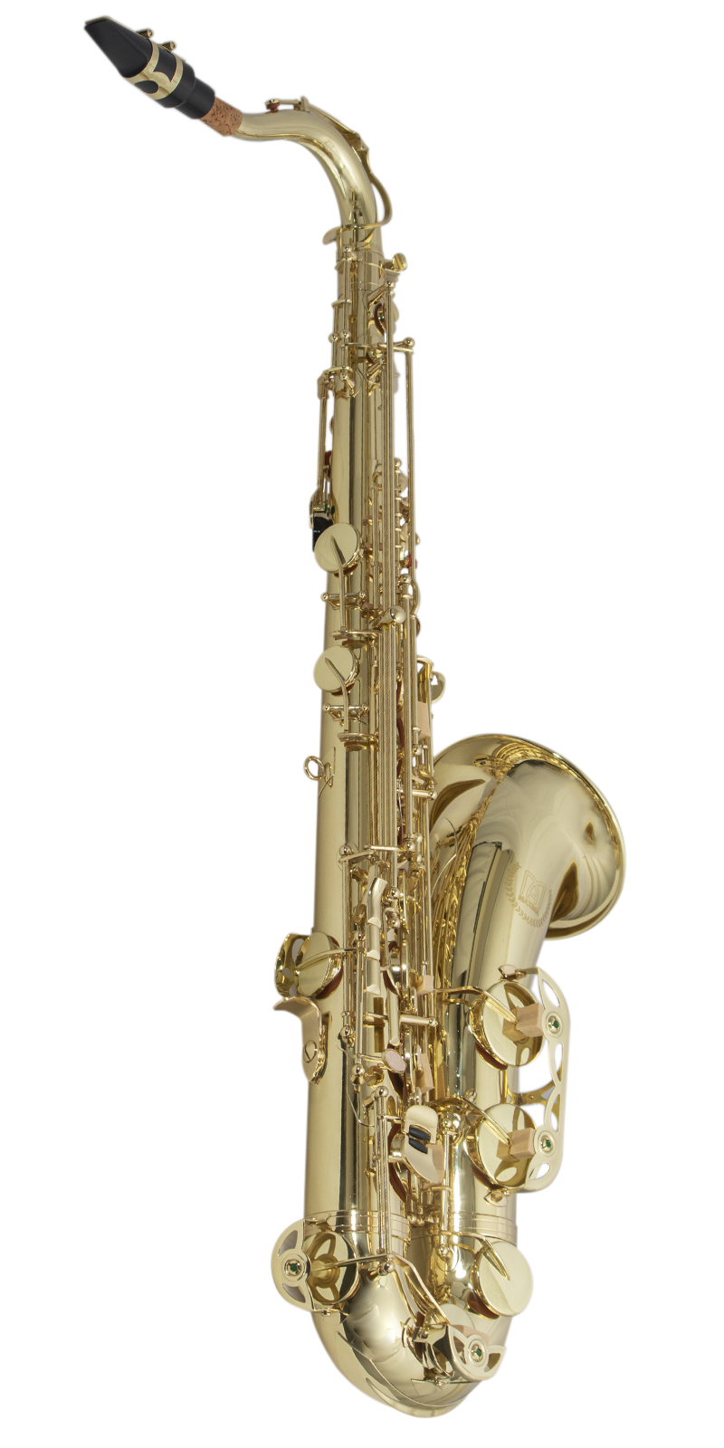 Saxofon Tenor Maxima, tono Bb, superficie de laca dorada en material de latón. Incluye funda de transporte, correa para el cuello, paño y varilla de limpieza, guantes blancos y 1 pieza de caña.