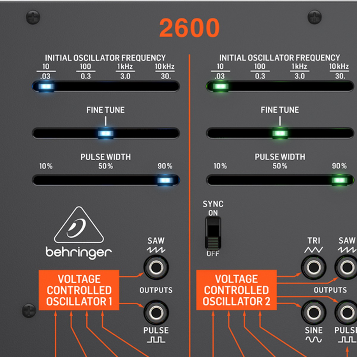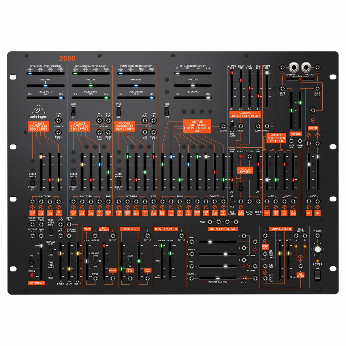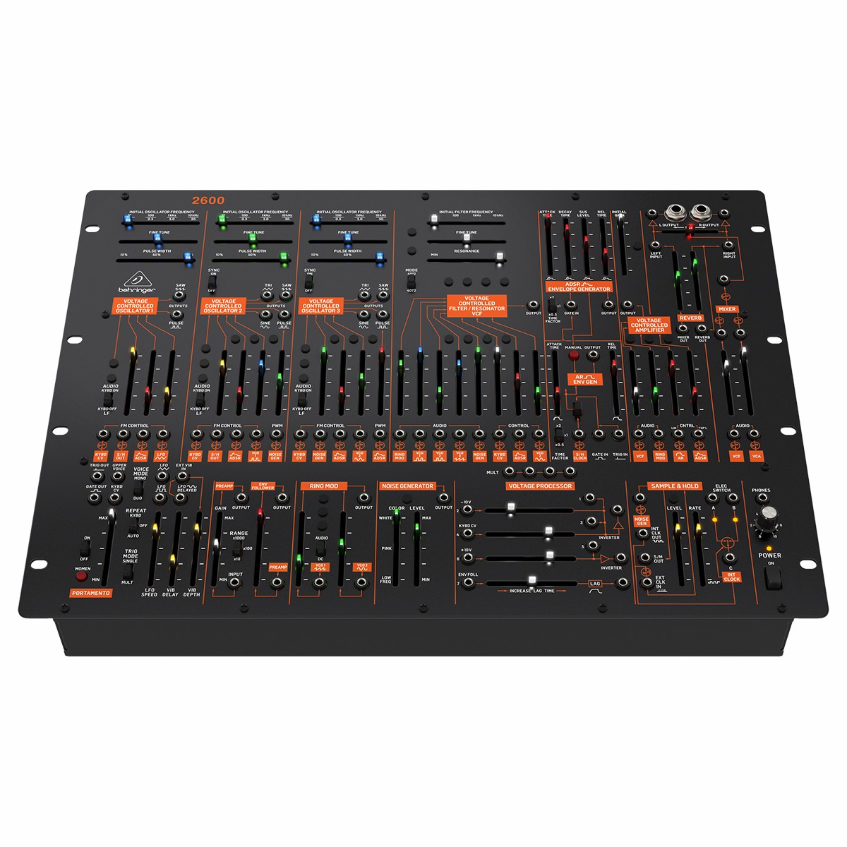 Sintetizador analógico semimodular con 3 VCO y VCF multimodo en formato de montaje en rack de 8U, permite una creación de música increíblemente gruesa, reproducción auténtica de los circuitos originales ”2600” con transistores y JFET combinados, la arquitectura semimodular no requiere parches para un rendimiento inmediato, 3 VCO, cada uno con modo LFO, entradas FM y múltiples salidas en forma de onda para una impresionante paleta de posibilidades tonales, VCF multimodo con salida de paso bajo dedicada con salida adicional conmutada alta/notch, increíble variedad de módulos que incluyen ring modulator, lag processor, sample & hold, Schmitt trigger y seguidor envelope, generadores de envolvente ADSR y AR con factor de tiempo conmutable, spring reverb digital realista para inspiradores efectos de sonido, generador de ruido con color continuamente variable, 2 LFO’s dedicados con salidas de onda sinusoidal y de pulso, opción de distorsión de filtro posterior conmutado (PFD) / inversor en el procesador de voltaje, entrada diferencial (+/-) VCA con entradas de control lineales y exponenciales, las funciones adicionales incluyen atenuador, mezclador, inversor, limitador de velocidad de respuesta y múltiple de 4 vías para una flexibilidad de parcheo creativa, entrada de audio externa para procesar fuentes de sonido externas, 58 faders y 15 botones te brindan acceso práctico, directo y en tiempo real a todos los parámetros, 83 entradas / salidas de cable de conexión para lo último en flexibilidad de configuración, potente salida de audífonos con control de nivel dedicado, implementación MIDI completa con canal MIDI y selección de prioridad de voz.