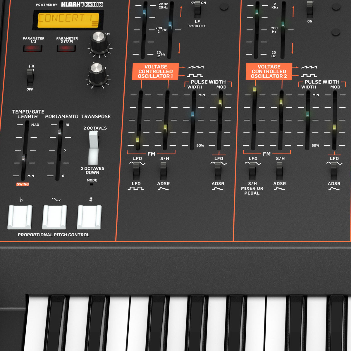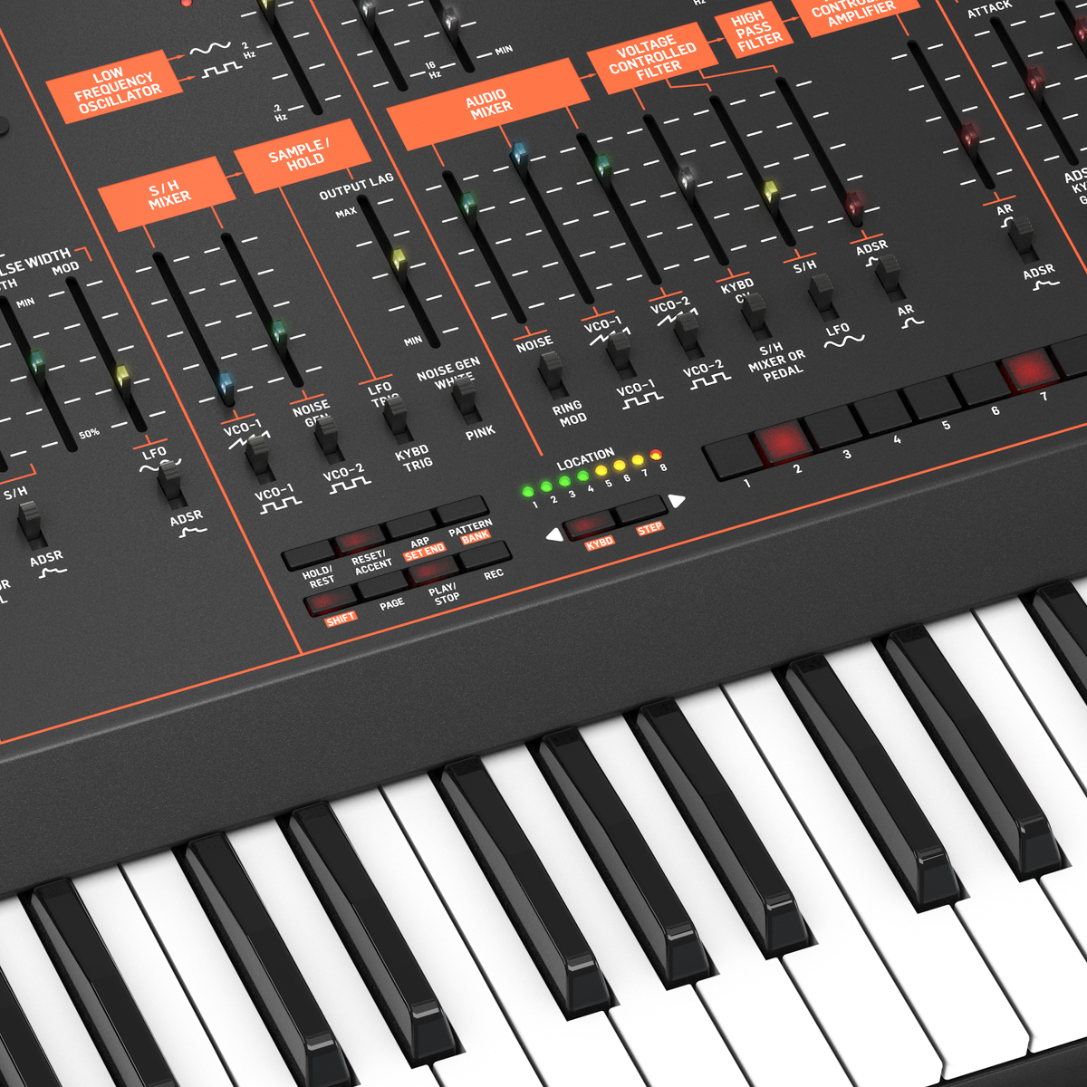 DC Input Jack: 9 VDC, 1300 mA.MIDI In/Out: 5-pin DIN / 16 canales.USB: USB 2.0, tipo B.Salidas: 1/4″ TS, desbalanceado máximo -20 dBu, XLR macho, balanceado máximo +4 dBu.Audífonos: 1/4″ TRS, máximo 50 mW + 50 mW.Entrada de audio externo: 1/4″ TS, máximo -10 dBu.Pedal: 1/4″ TS.Footswitch de portamento: 1/4″ TS.Entradas TS 3.5 mm: Control de vltahe: 1 V/oct, gate: +3 V mínimo, trigger: +3 V pulso mínimo.Salidas TS 3.5 mm: Control de voltaje: 1 V/oct, gate: +10 V, trigger: +10 V pulso.