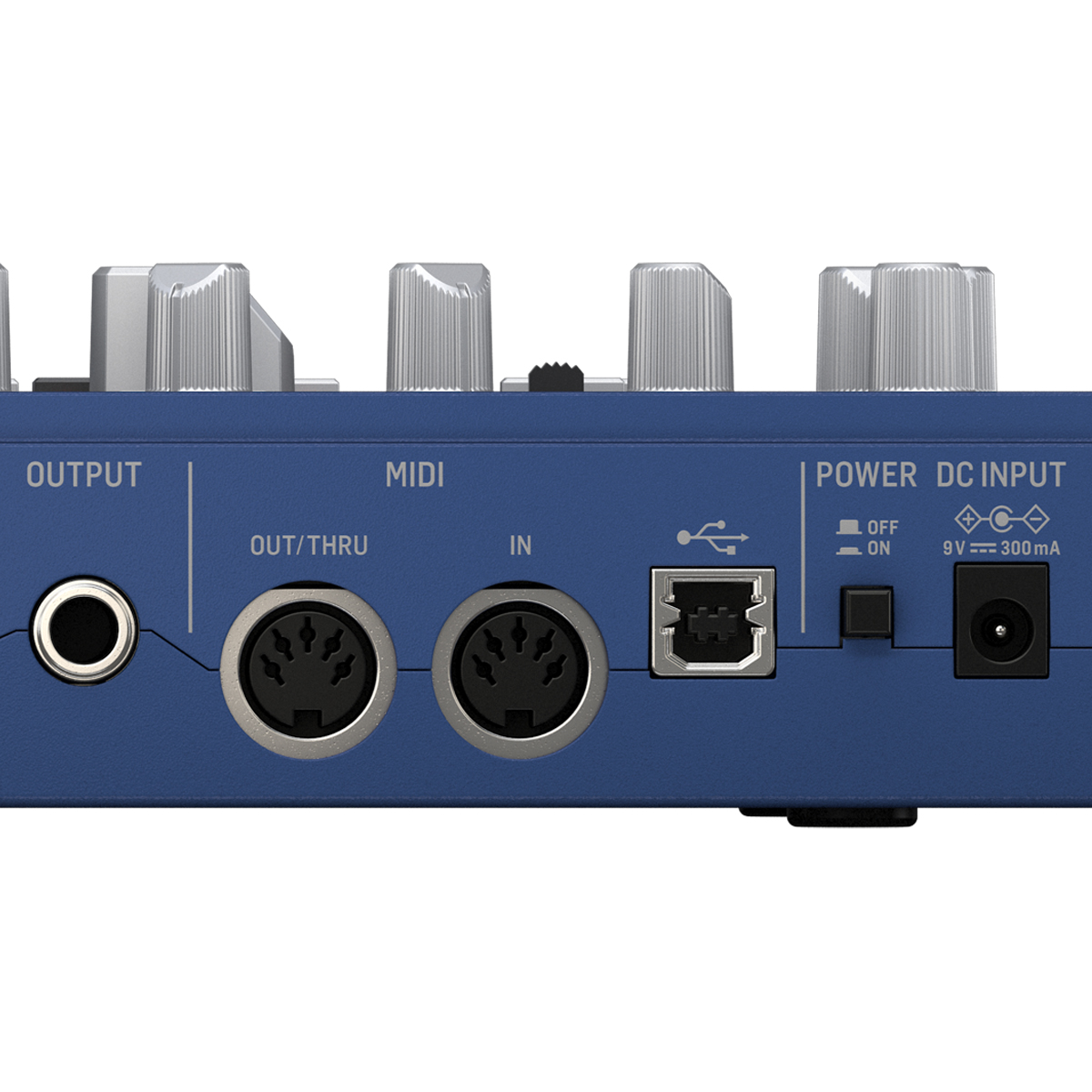 Entrada de alimentación: Conector de entrada DC.Switch de encendido: Botón push On/Off.MIDI In/Thru: MIDI In y MIDI Thru, DIN de 5 pines.USB (MIDI): USB 2.0, tipo B.Salidas: Salida Line: 1/4″ TRS, desbalanceado, máximo +8 dBu.Impedancia de salida. 1.5 kilo-ohms.Audífonos: 3.5 mm TRS, máximo 50 mW/32 ohms (1 KHz, 1% THD).Impedancia de salida de audífonos: 15 ohms.