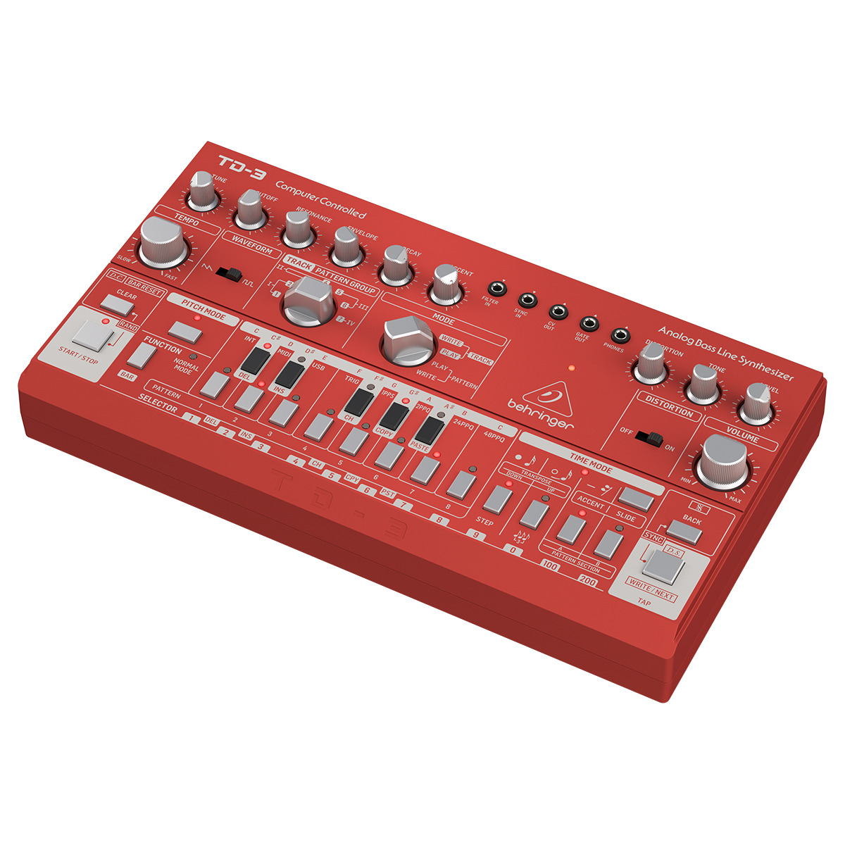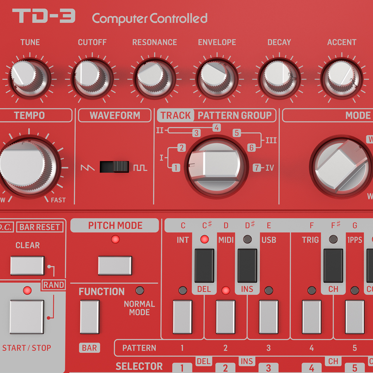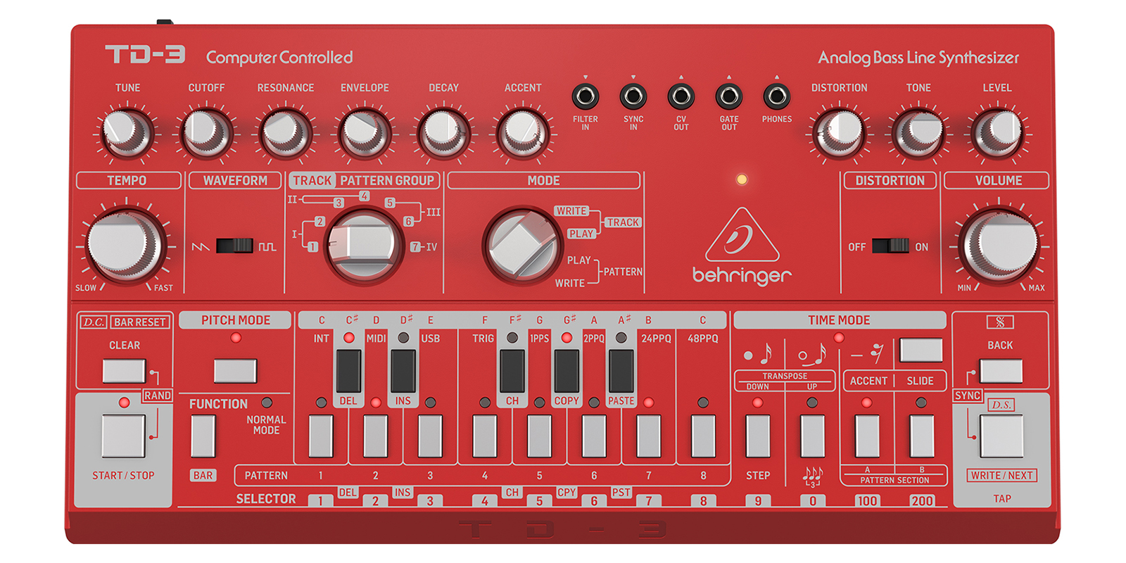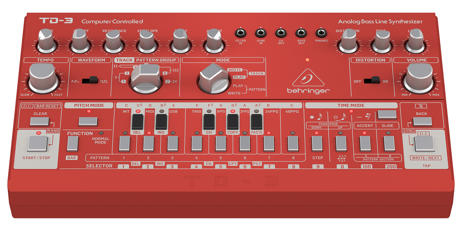 Número de voces: Monofónico.Tipo: Análogo.Osciladores: 1.VCF: 1 low pass.Envelopes: 1.