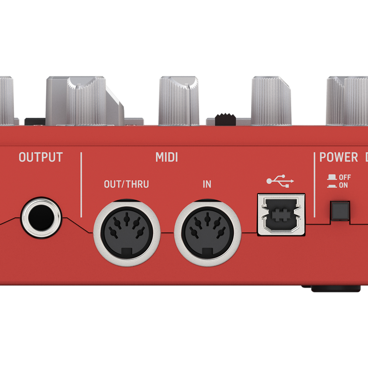 Entrada de alimentación: Conector de entrada DC.Switch de encendido: Botón push On/Off.MIDI In/Thru: MIDI In y MIDI Thru, DIN de 5 pines.USB (MIDI): USB 2.0, tipo B.Salidas: Salida Line: 1/4″ TRS, desbalanceado, máximo +8 dBu.Impedancia de salida. 1.5 kilo-ohms.Audífonos: 3.5 mm TRS, máximo 50 mW/32 ohms (1 KHz, 1% THD).Impedancia de salida de audífonos: 15 ohms.