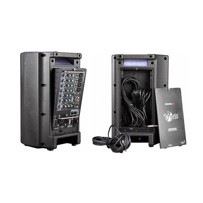 Amplificador clase D dual de 250 watts con SMPS.Altavoces de 2 vías con driver de compresión de 1.35″ pulgadas y woofer de 10″ pulgadas.2 cables Proel con jack de metal de 1/4″ de 7.5.