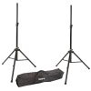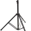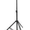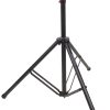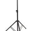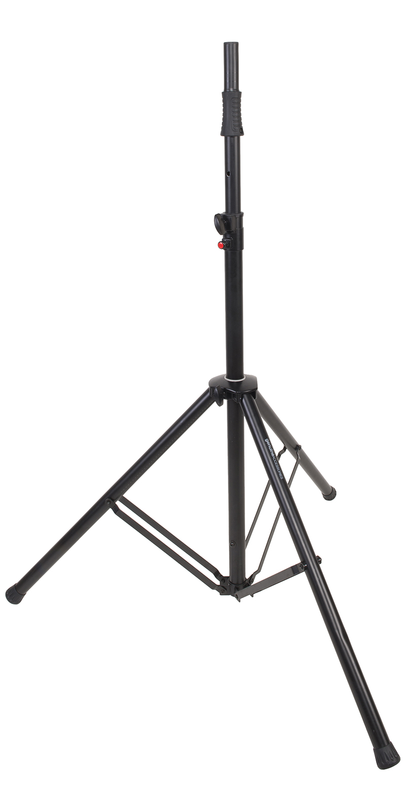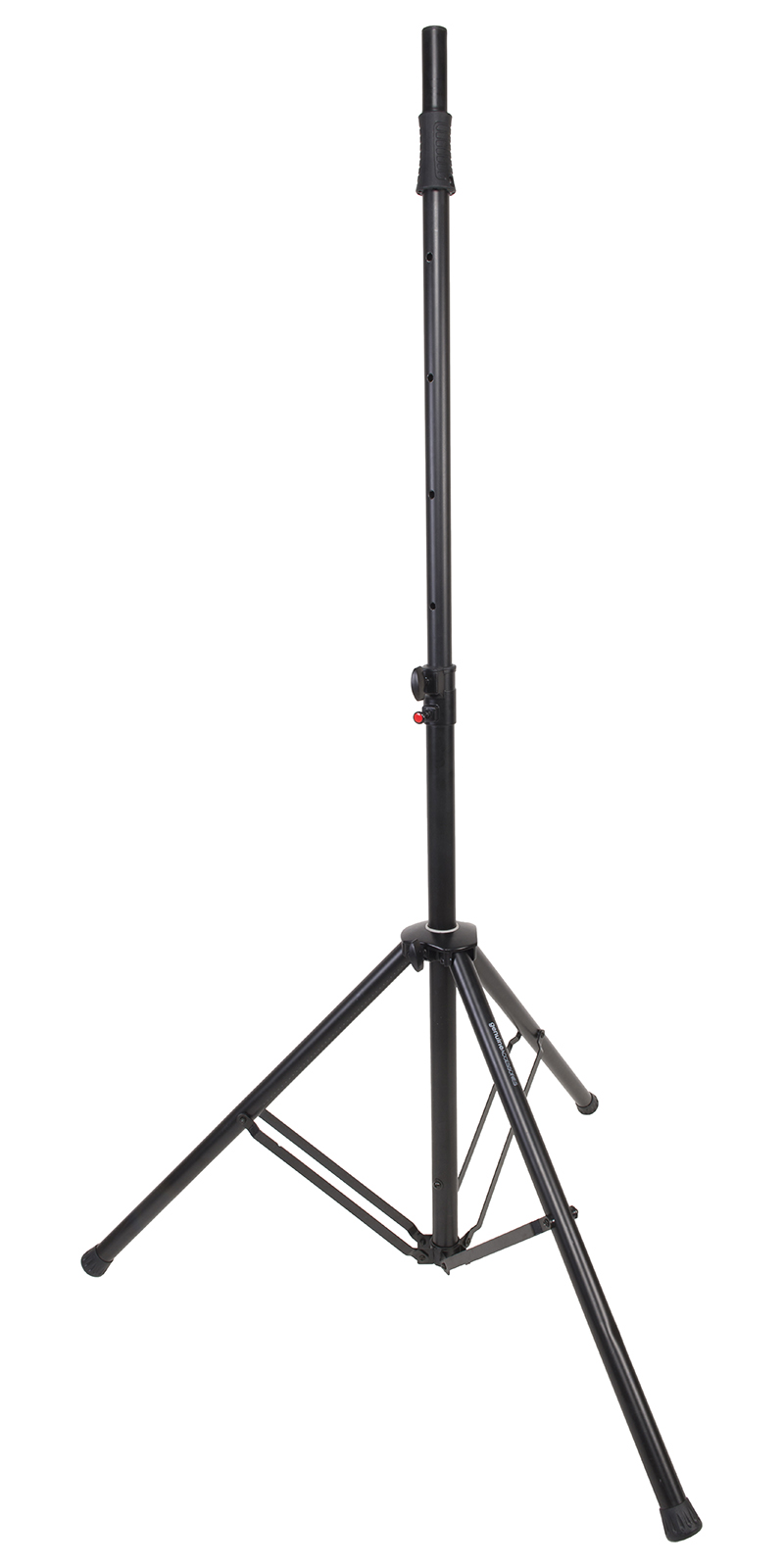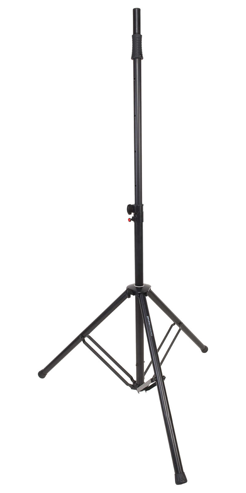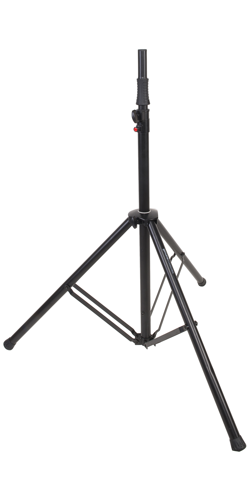 Soporte profesional de alta resistencia para bafle, fabricado con acero tubular, piezas de aluminio fundido, mecanismo de elevación automático alimentado por sistema interno de aire comprimido, altura ajustable: 1280 – 2000 mm, carga máxima: 50 kg, base: 1200 mm, tubo terminal: 35 mm, peso: 5 kg.