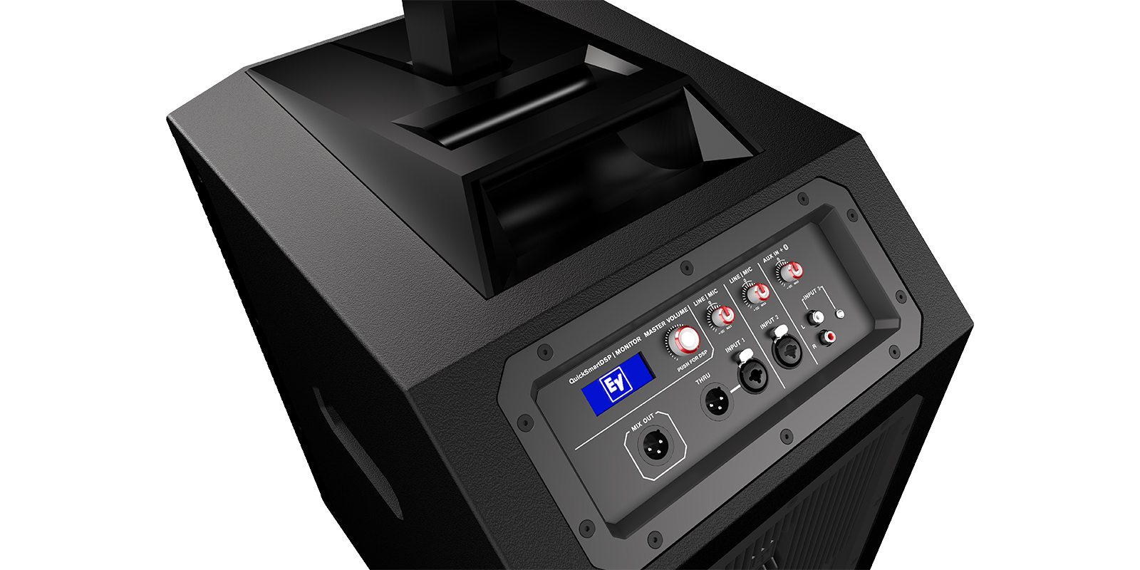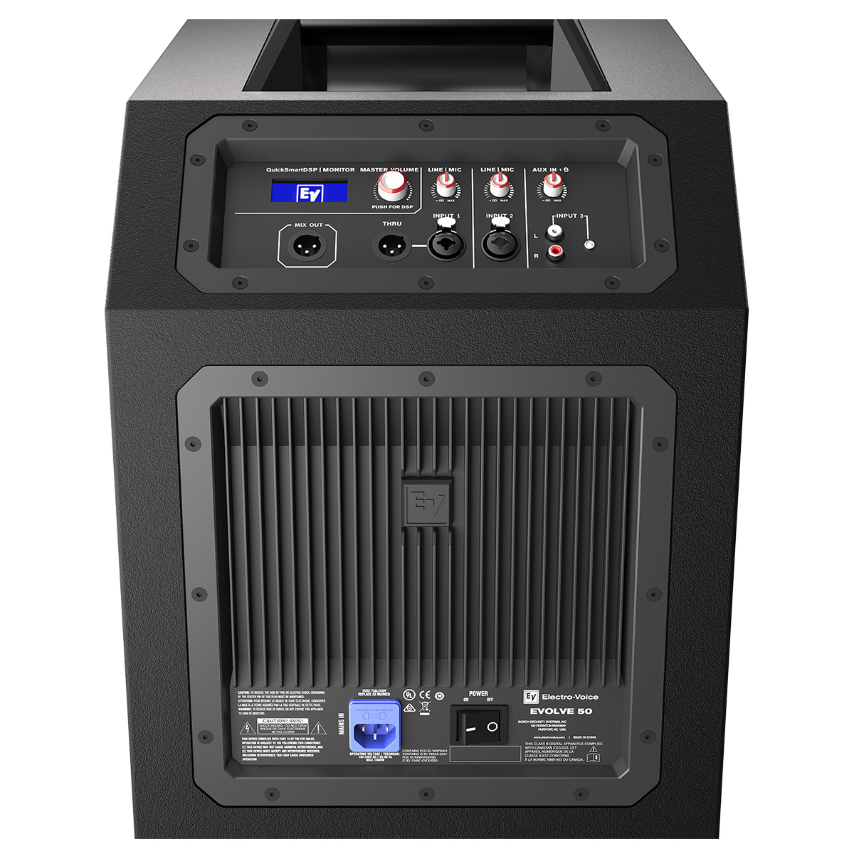 El sistema EVOLVE 50 se ha diseñado para poder transportarlo y montarlo de forma fácil y rápida. El diseño de tres asas del subwoofer proporcionan una resistencia mínima que permite obtener un excelente sonido profesional en cualquier lugar en el que se necesite. La instalación resulta más fácil gracias a la barra de aluminio simétrica del subwoofer, que incorpora un conjunto de cables integrado. La conexión se fija mediante el seguro magnético, que inmoviliza la barra del subwoofer en su sitio utilizando un sistema de imanes. El gabinete venteado del subwoofer incorpora un woofer de 12 pulgadas es de madera de 18 mm para aumentar la robustez y el rendimiento acústico.