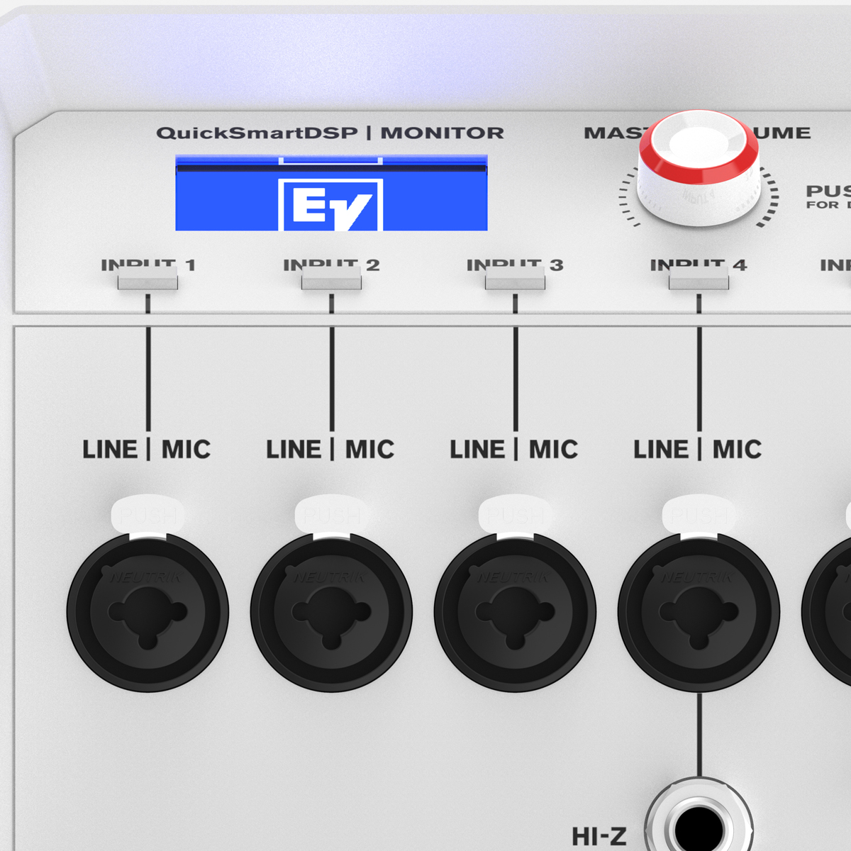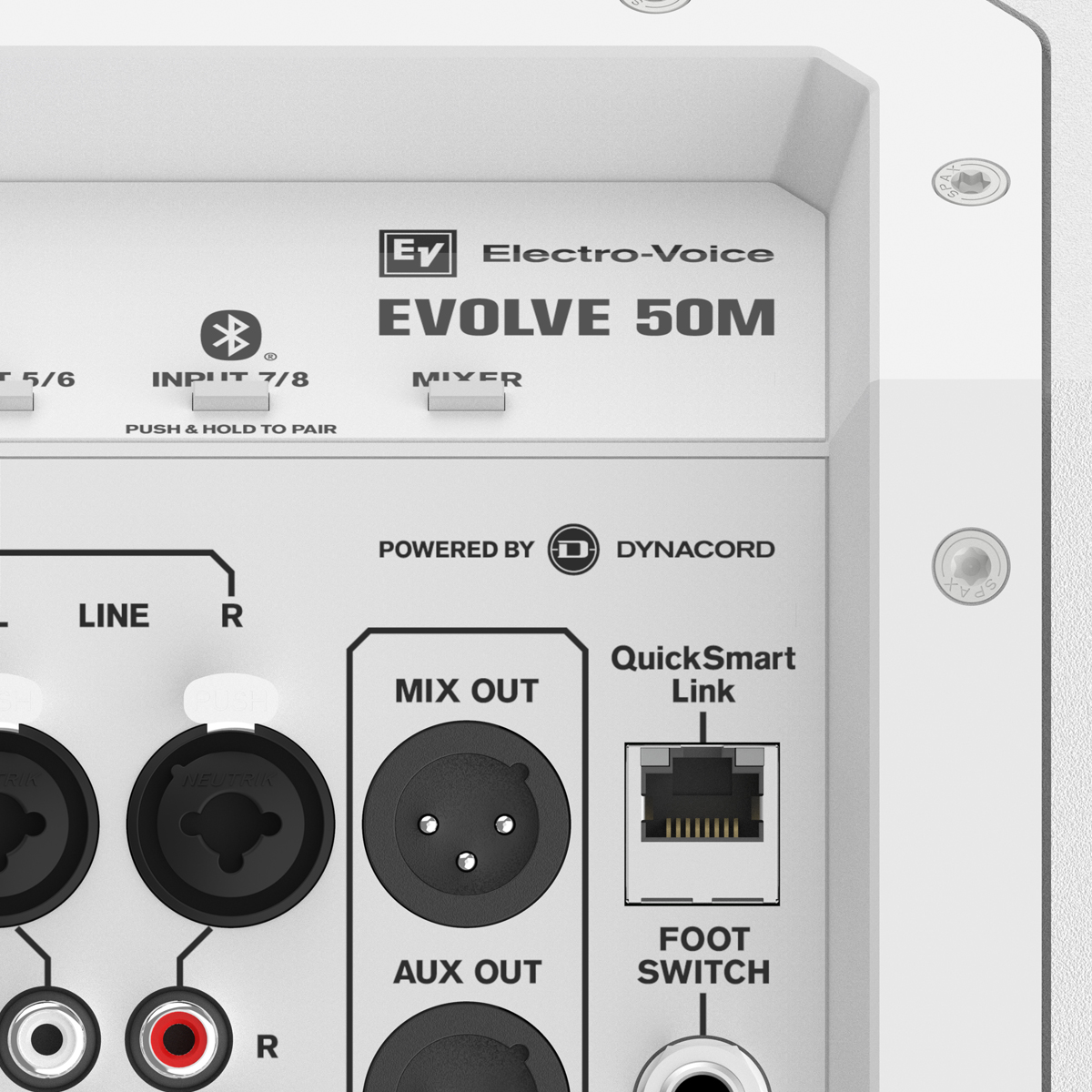 Como novedad de Electro-Voice, QuickSmart Link facilita la combinación de dos EVOLVE 50M para su uso junto con bandas más grandes o conciertos que necesitan más entradas. Simplemente conecta los sistemas a través de un cable Ethernet para crear una conexión de control de audio digital sin compresión, empareja ambos sistemas con un sólo dispositivo móvil a través de la aplicación QuickSmart Mobile (disponible a través de la App Store y en Google Play) y obtén un control total de la mezcla de ambos sistemas. Para aplicaciones que requieren menos entradas, pero que aún requieren una mezcladora y una salida estéreo, e EVOLVE 50M se puede combinar con un EVOLVE 50 a través del conector MIX OUT XLR.