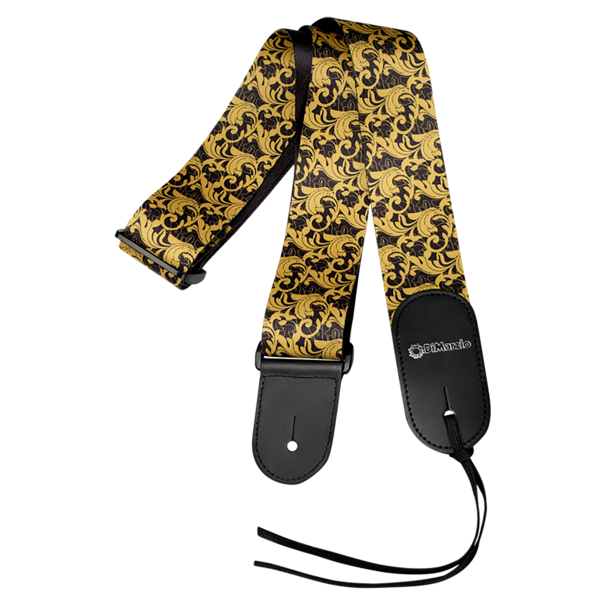 Steve Vai ha utilizado los tahalíes de guitarra ClipLock® Quick Release de DiMarzio durante más de 20 años. Nos complace ofrecer una versión estándar de las correas UtoPIA de Steve Vai. El diseño UtoPIA negro y dorado fue creado para combinar con la guitarra Ibañez PIA de Steve y presenta un patrón de hojas de remolino barroco dorado sobre un fondo negro. Este tahalí está hecho de microfibra impresa de alta calidad y los extremos del tahalí son de cuero cosido y con botones en una guitarra eléctrica. Se incluye un cable de conexión para usar en una guitarra acústica. También está disponible en blanco y dorado o rosa y dorado.