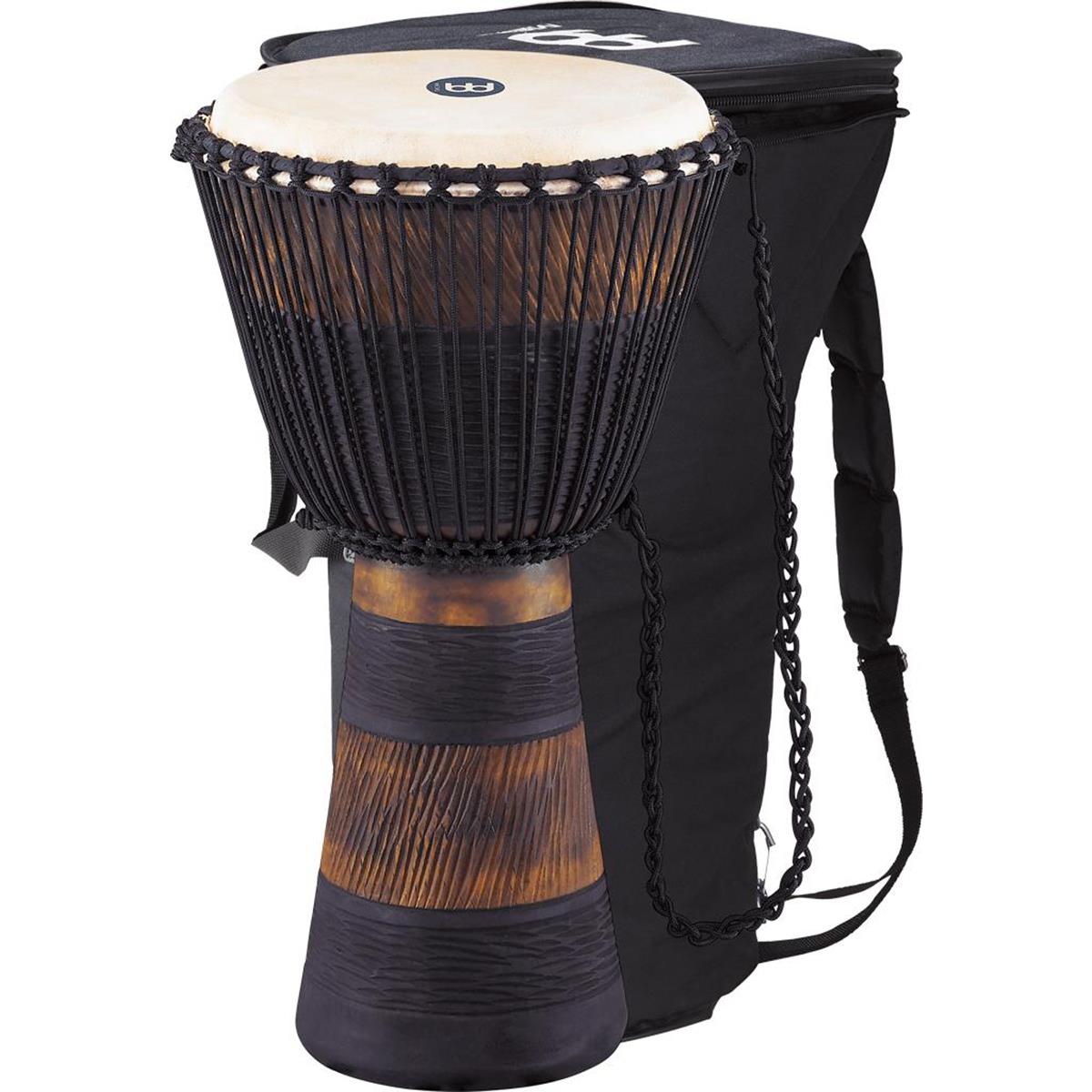El djembe africano de Meinl está fabricado con una sola pieza de madera de caoba escarbada a mano para poder mantener el sonido natural de la madera.