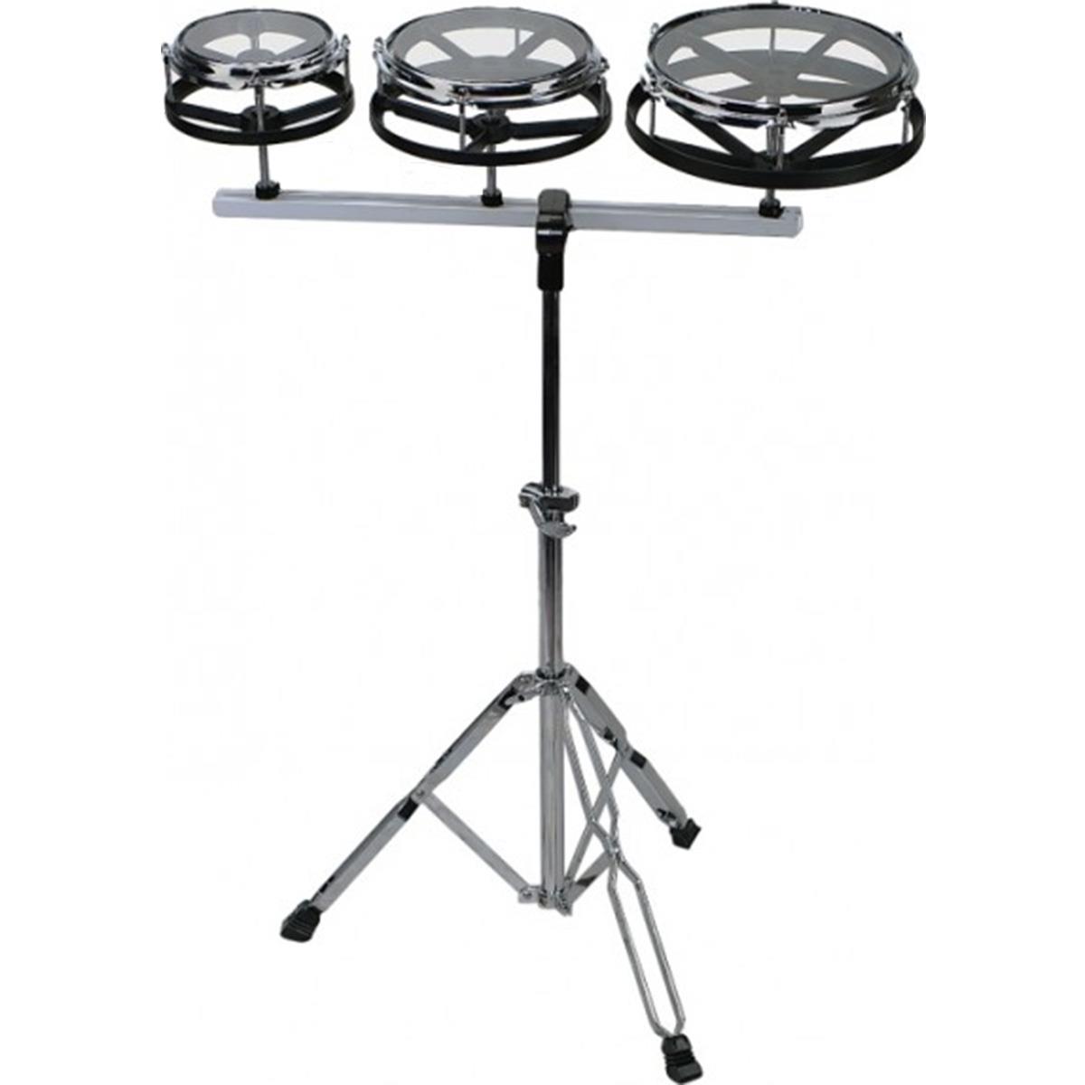 Estos rototoms de New beat marcan la diferencia de sonido y te ofrecen más posibilidades para lograr otro tipo de redobles. Son 3 toms, uno de 6″, uno de 8″ y uno de 10″ pulgadas. No tienen cuerpo de madera, solamente es el parche estirado por una estructura metálica, lo que te ofrece un sonido más agudo y con un mejor ataque.
