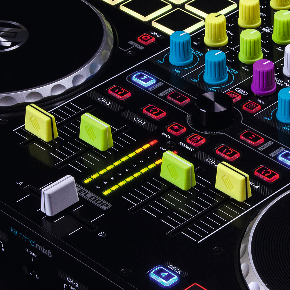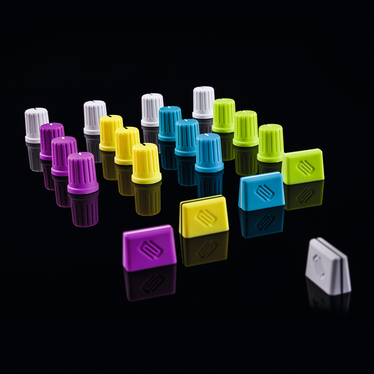 Tapas de fader, recubrimiento de goma para un agarre firme, tamaño ergonómico, fácilmente intercambiables, diseño individual para tu equipo, 5 colores frescos y deslumbrantes de estilo neón, es compatible con la mayoría de las mezcladoras y controladores de DJ, peso: 14 g, dimensiones: 15 x 8 x 3 mm.