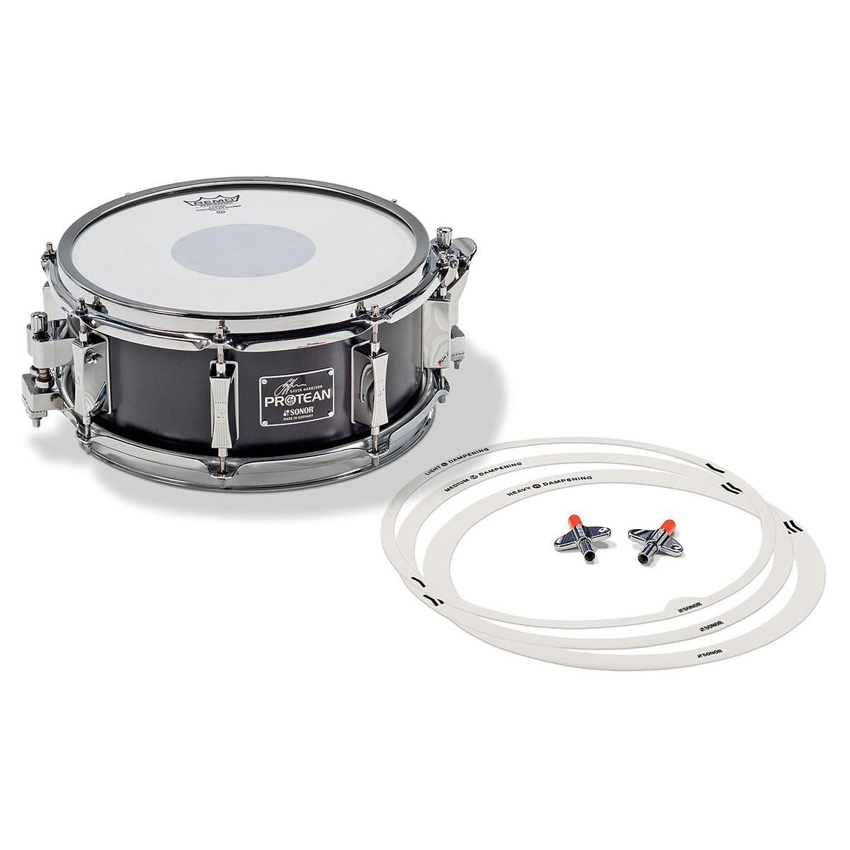 La tarola signature de Gavin Harrison “Protean” está fabricada a mano en Alemania y se ofrece en dos tamaños: 14″ x 5.25″ pulgadas y 12″ x 5″ pulgadas. Cuentan con 6 capas de madera de abedul para formar una concha de 6 mm. El acabado Silky Black se compone con capas blancas base entre los accesorios de cromo y la concha.