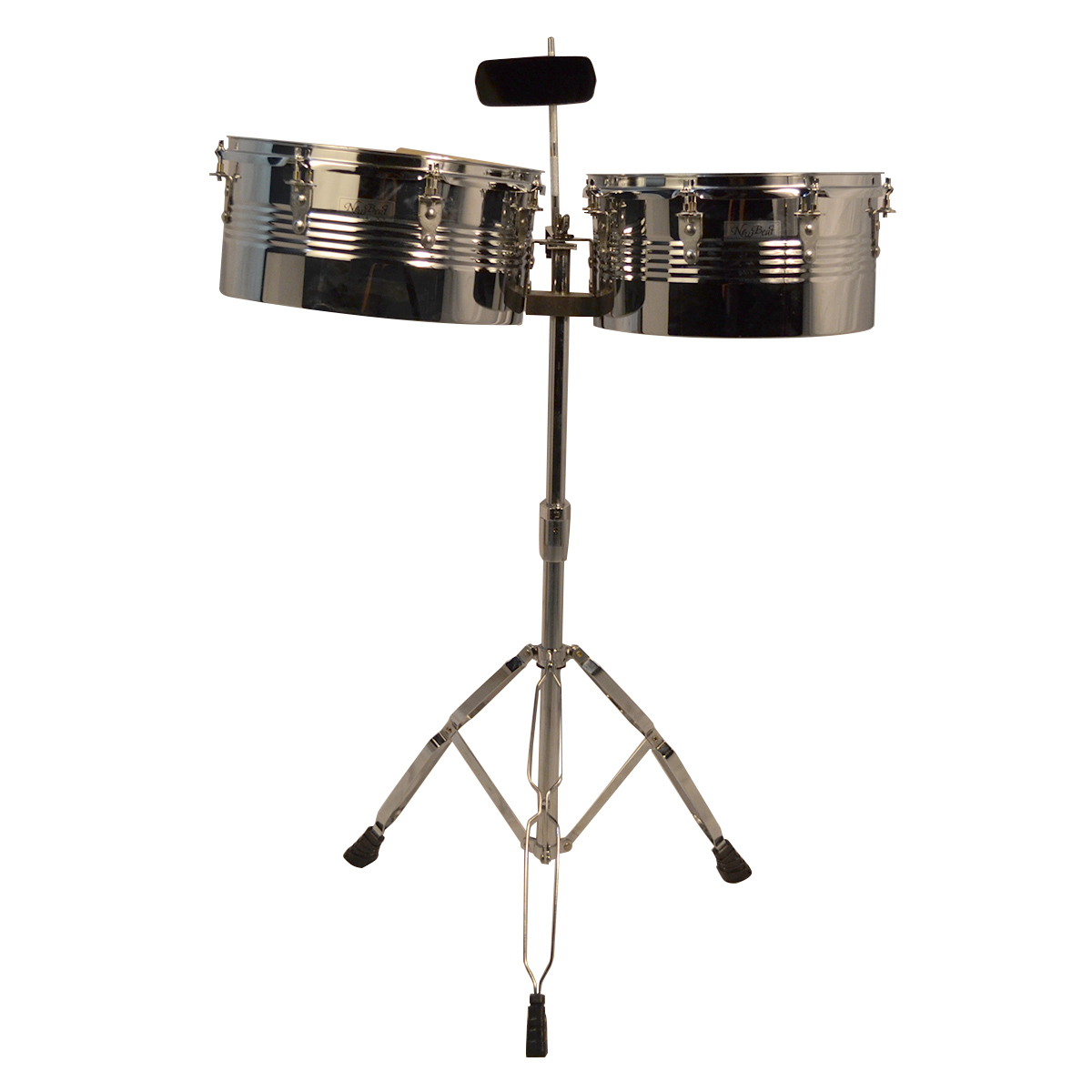 Timbales New Beat. Modelo: LT-156C. Fabricados con acero. De 13” y 14” pulgadas.Terminado cromado. Vaso corto de 6” pulgadas. Incluye atril de doble solera, atril para cencerro, cencerro, baquetas y llave para afinar.