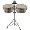 Los timbales New Beat son instrumentos realizados para trabajar fuerte, son resistentes y están diseñados para producir el sonido tradicional de la música latina.Están fabricados con acero y terminados en cromo, vasos cortos de 6” pulgadas y montado sobre un resistente atril de doble solera. Sistema de ángulo ajustable.Viene listo para tocar, incluye un par de baquetas, llave para afinar y un cencerro con base.