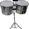 Los timbales New Beat son instrumentos realizados para trabajar fuerte, son resistentes y están diseñados para producir el sonido tradicional de la música latina.Están fabricados con acero y terminados en cromo, vasos largos de 11” pulgadas y montado sobre un resistente atril de doble solera. Sistema de ángulo ajustable.Viene listo para tocar, incluye un par de baquetas, llave para afinar y un cencerro con base.