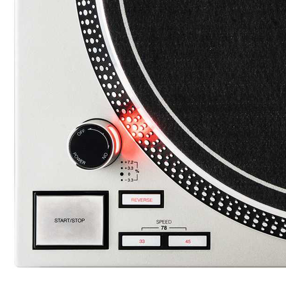 Tipo: Tornamesa direct-drive.Drive: Quartz driven upper-torque direct drive.Motor: Motor de 16 polos y 3 fases, brushless.Velocidad de tornamesa: 3 velocidades, manual (33 1/3, 45 y 78 RPM).Torque de arranque: 2.8 – 4.5 kg/cm (ajustable).Tiempo de parada ajustable (0.2 – 6 seg).Tiempo de inicio/Cambio de RPM: 55dB (DIN-B).Sistema de frenado: Freno electrónico.Peso recomendado de disco: 800 g.