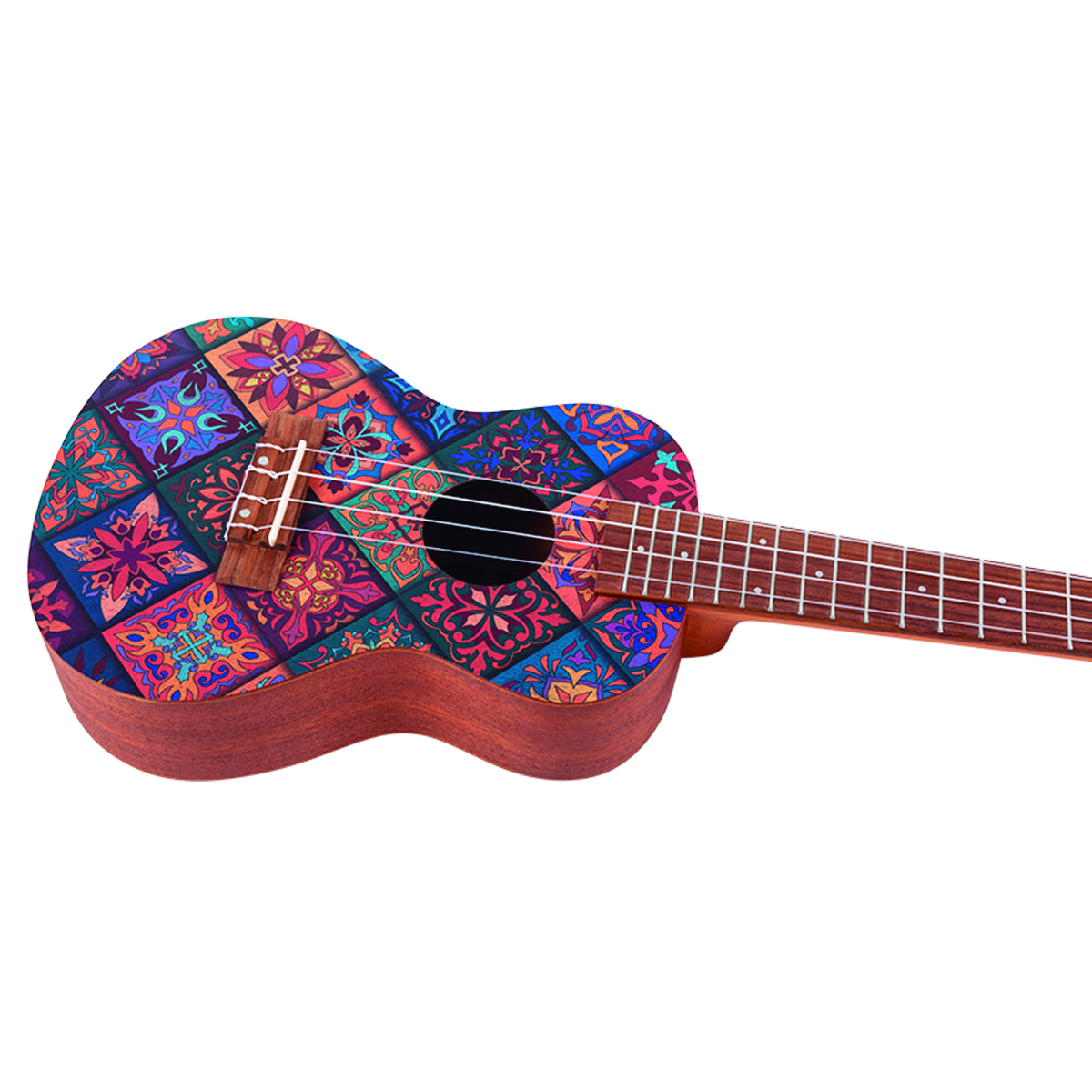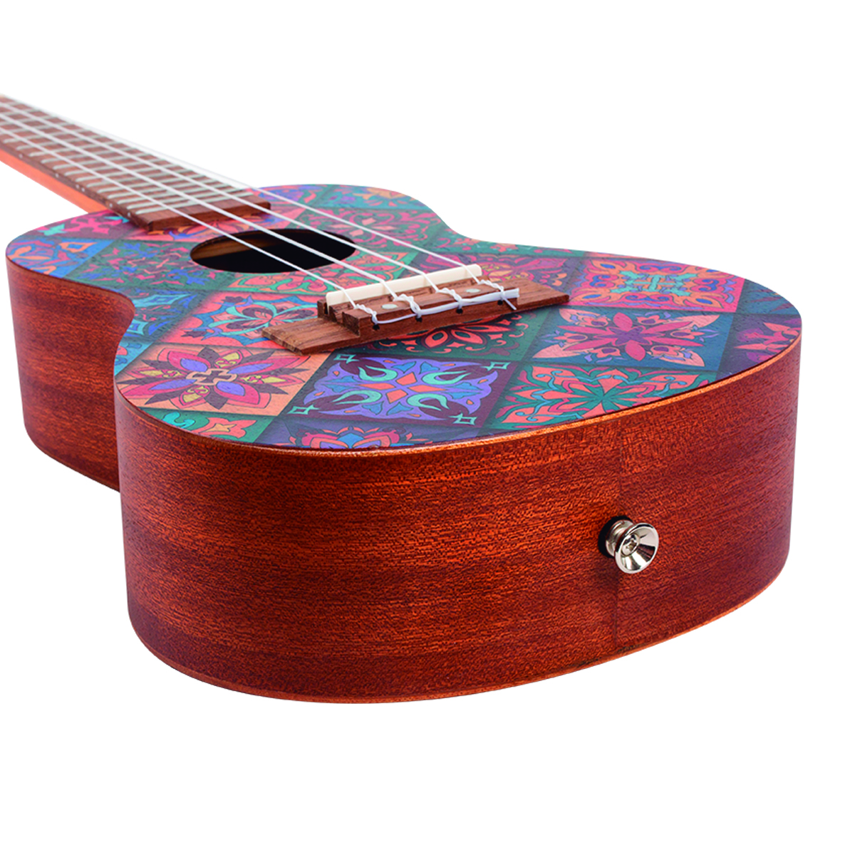 Cuerpo de caoba laminada con un increíble diseño de tapa armónica de abeto. En esencia, el AUC-33 Fusion es un excelente ukelele de caoba laminada, pero presenta un arte increíble en la caja de resonancia. No se han tomado atajos con el diseño de estos instrumentos, suenan y se tocan tan bien como se ven.