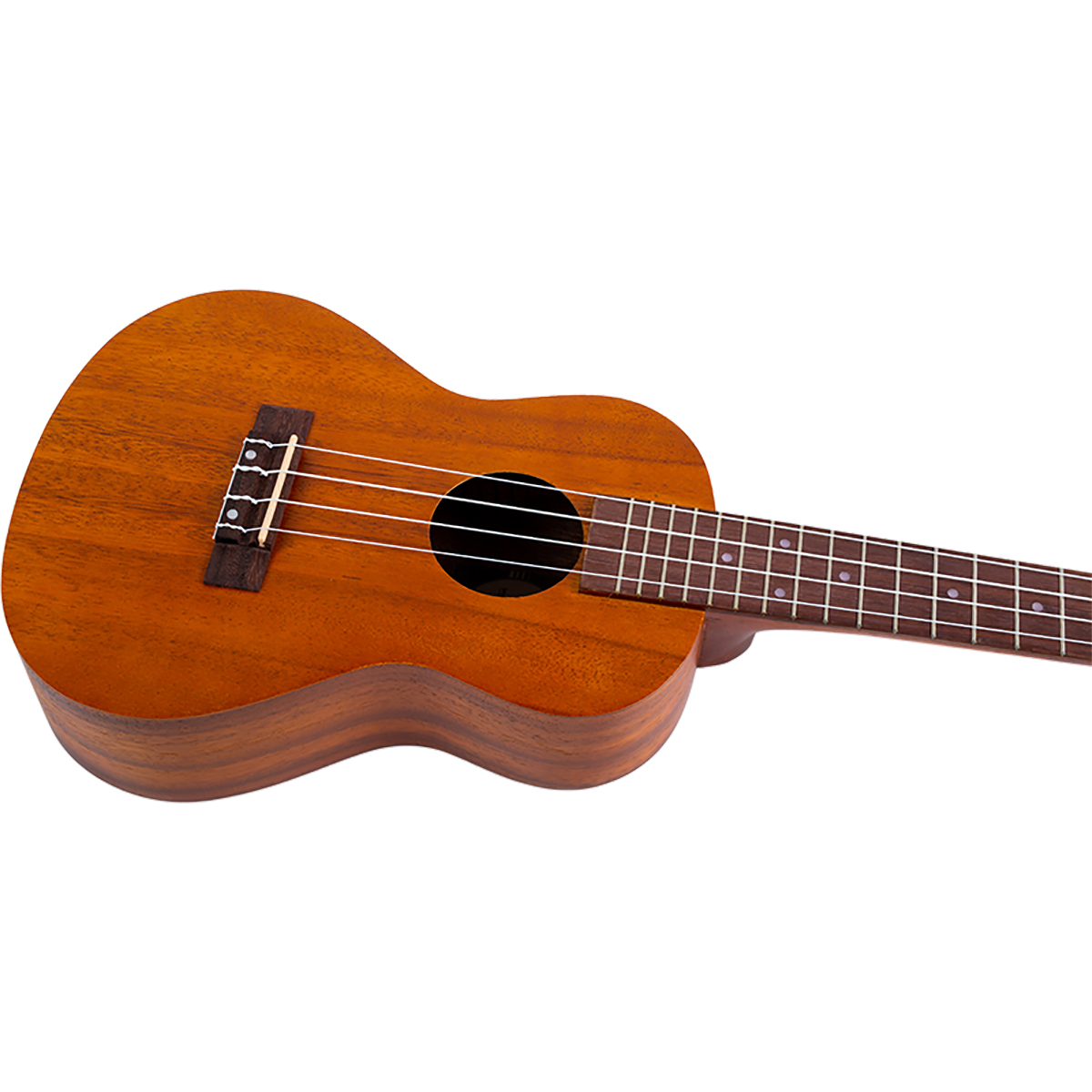 La idea errónea sobre un diapasón de soprano, es que los espacios entre los trastes son demasiado estrechos, lo que significa que los dedos de mayor tamaño no pueden formar acordes. La dificultad en realidad radica en el ancho del diapasón (llamado “ancho de la cejuela” en los círculos de ukelele). Muchos ukeleles hoy están hechos con un ancho de cejuela de 35 mm. Pensamos en crear un ukelele soprano con una cejuela de 38 mm. Esto le da a los dedos de todas las formas y tamaños una gran facilidad para formar acordes y agrega una gran comodidad y facilidad de ejecución al instrumento. Mientras hablemos del diapasón, está hecho de ñandú, una madera local de Indonesia. El brazo está hecho de meranti, que es similar a la caoba y es muy estable y fácil de trabajar.