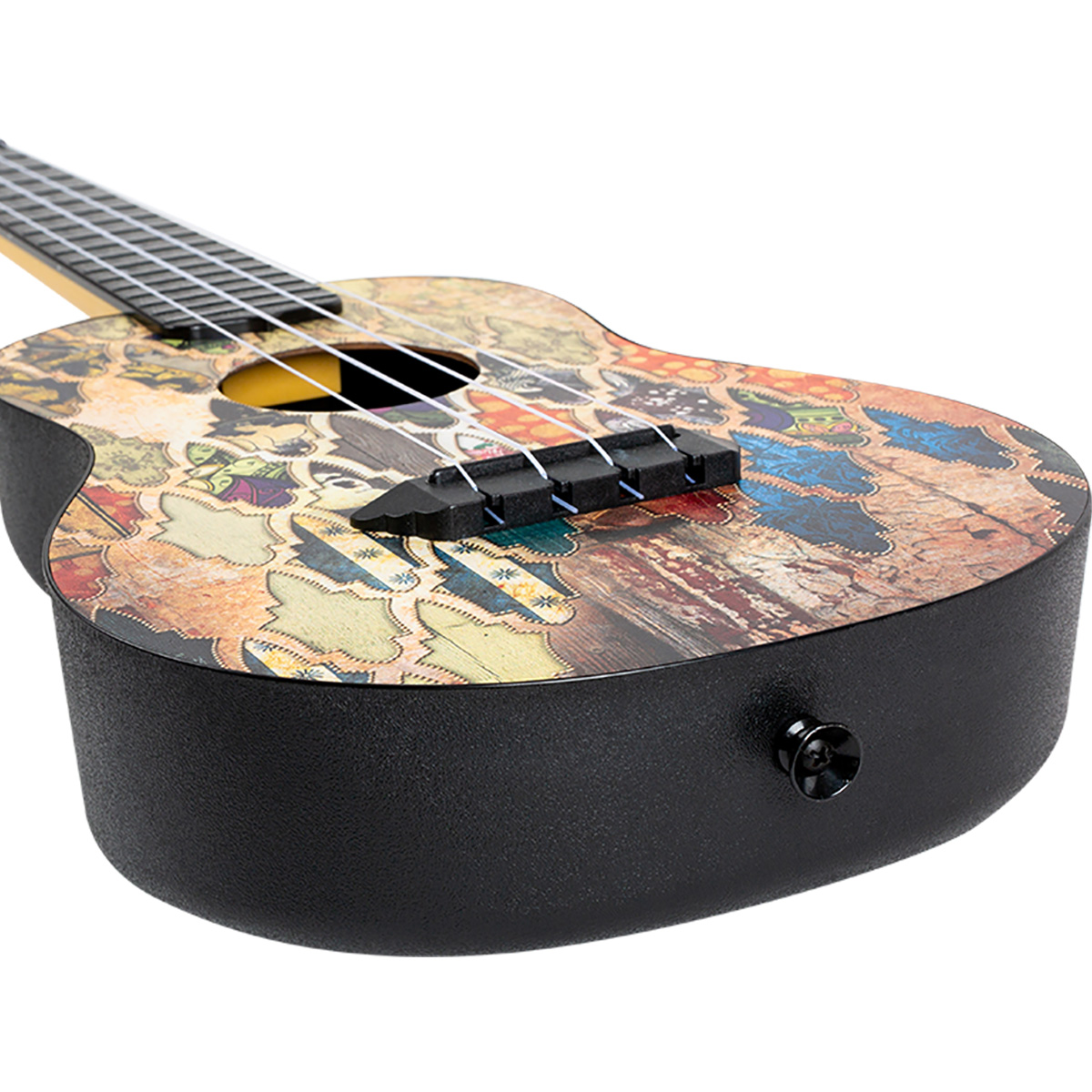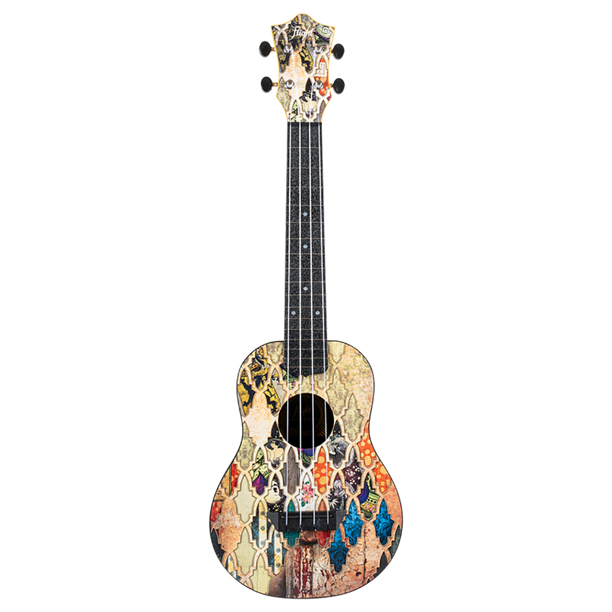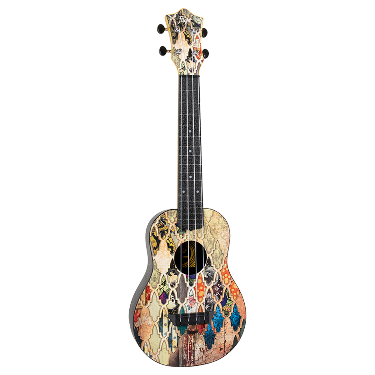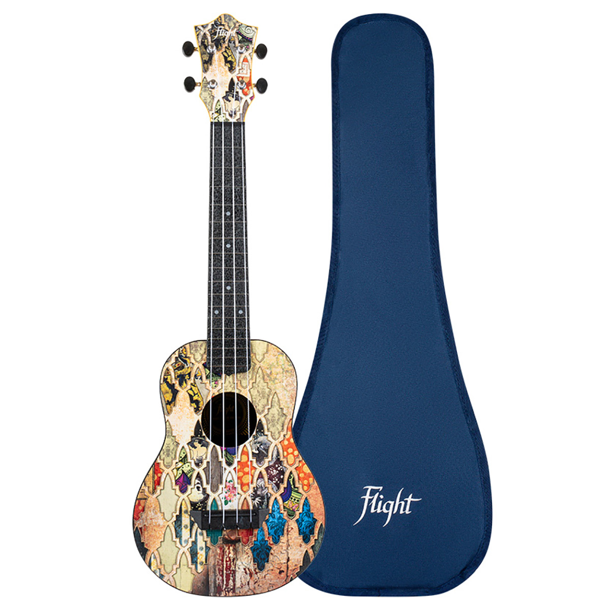 Los ukeleles Travel Flight han sido aclamados por su asombroso sonido, interpretación, dureza y valor. Los ukeleles Flight Concierto Travel (TUC) tienen un cuerpo ligeramente más grande y un diapasón ligeramente más largo que un ukelele Soprano Travel, lo que resulta en un sonido más grande: todas las cualidades de los TUS, pero a una escala mayor. Los músicos con manos más grandes disfrutarán el espacio extra en el diapasón. La tapa delantera del Flight TUC-40 Granada, hecha de madera tilo laminada, presenta un diseño inspirado por los cautivadores patrones arábicos del Palacio de Alhambra en Granada, España. El ukelele además posee cuerpo, brazo, diapasón y puente de ABS. El resultado es un ukelele de baja acción que es fácil de limpiar y mantener.