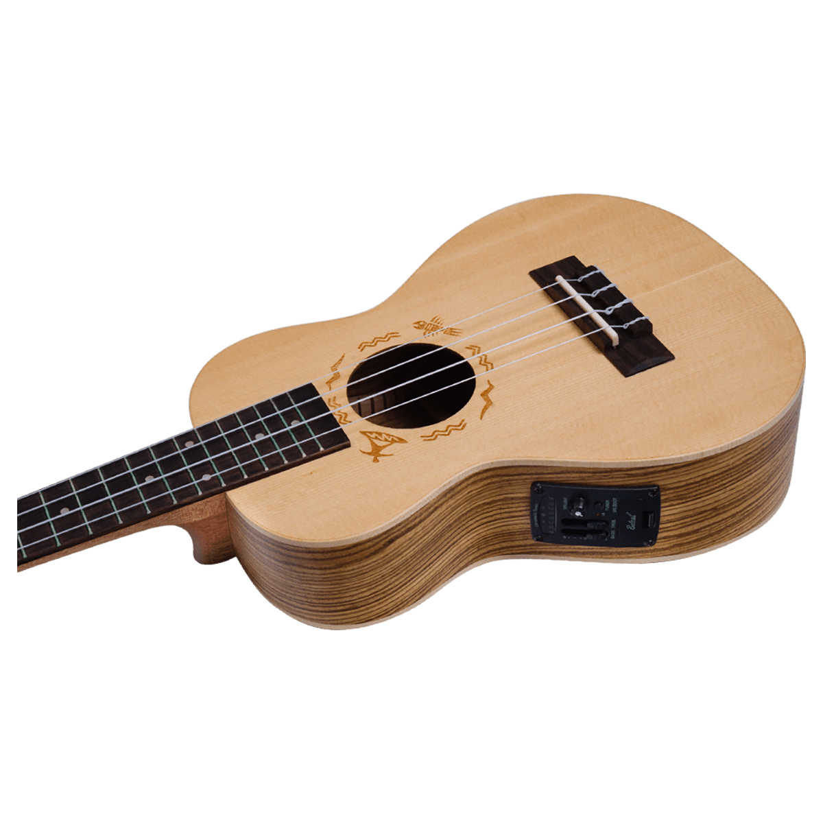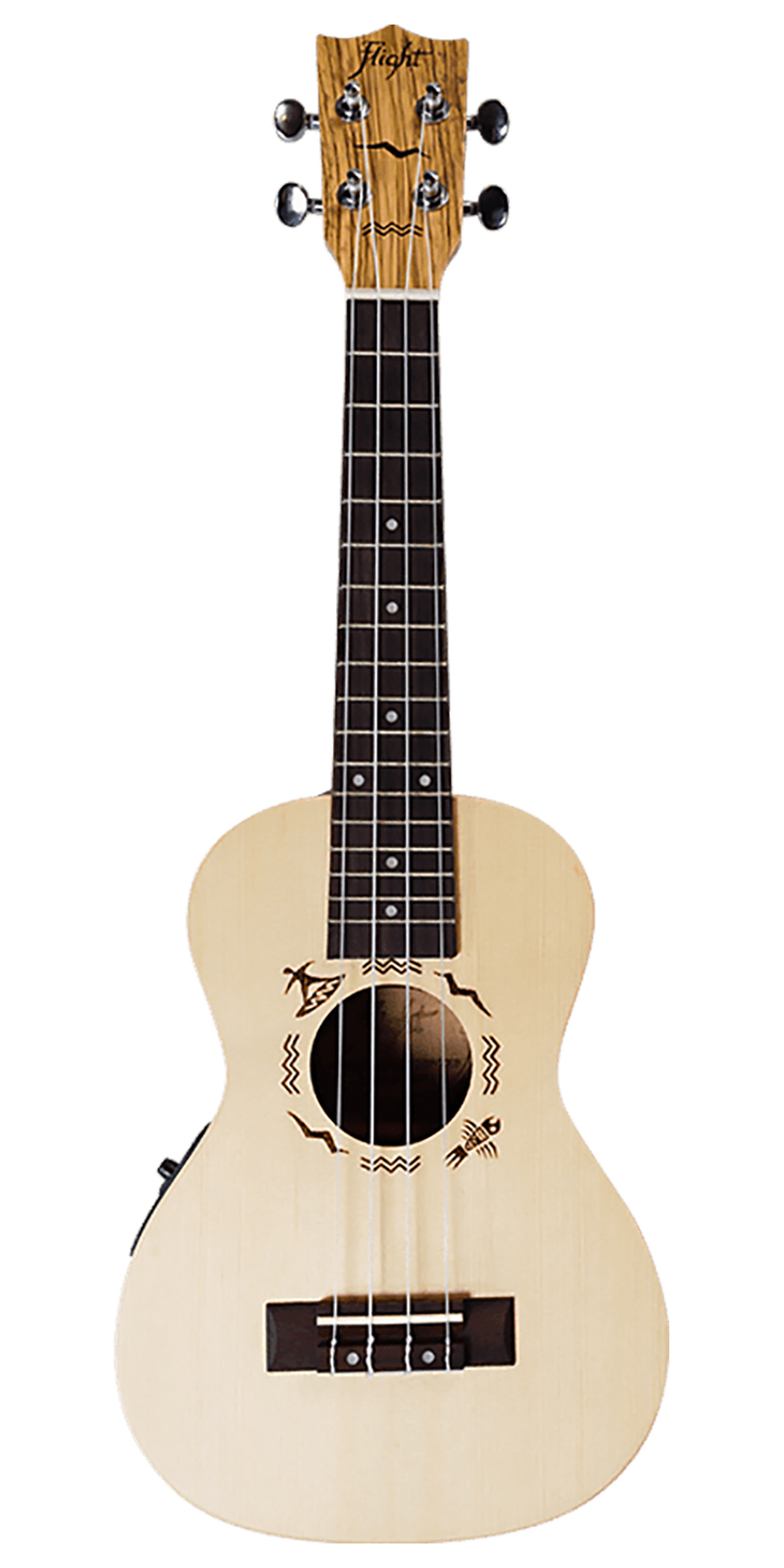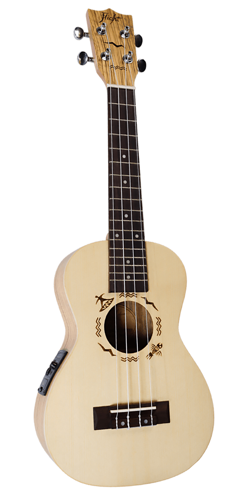 Abeto Engelmann macizo y Zebrawood.El ukelele Flight DUS525 EQ cuenta con una placa de sonido de abeto europeo Engelmann laminado y aros y fondo de zebrawood laminado. Estos se combinan para ofrecer un sonido potente y brillante cuando se hace un sólo en el registro alto y cálido y aterciopelado cuando se toca cuidadosamente junto a la chimenea. Finalmente puedes tenerlo de ambas maneras. Las rosetas de nuestros ukeleles están dibujadas a mano y grabadas con láser. Cada modelo tiene un diseño único. ¿Cuál es tu favorito?