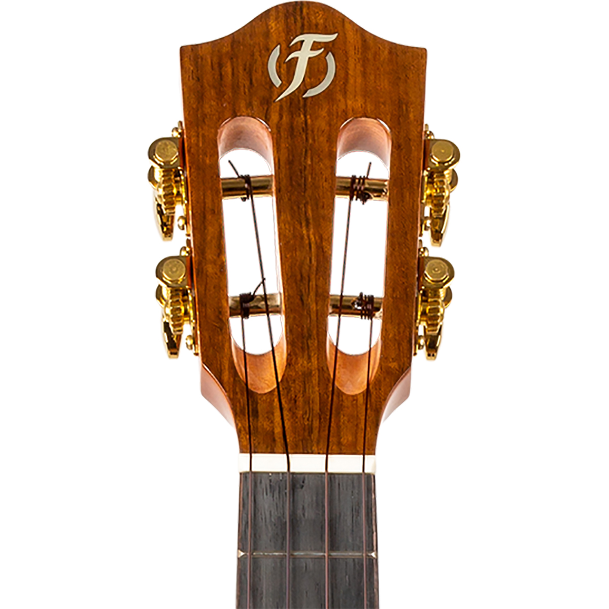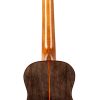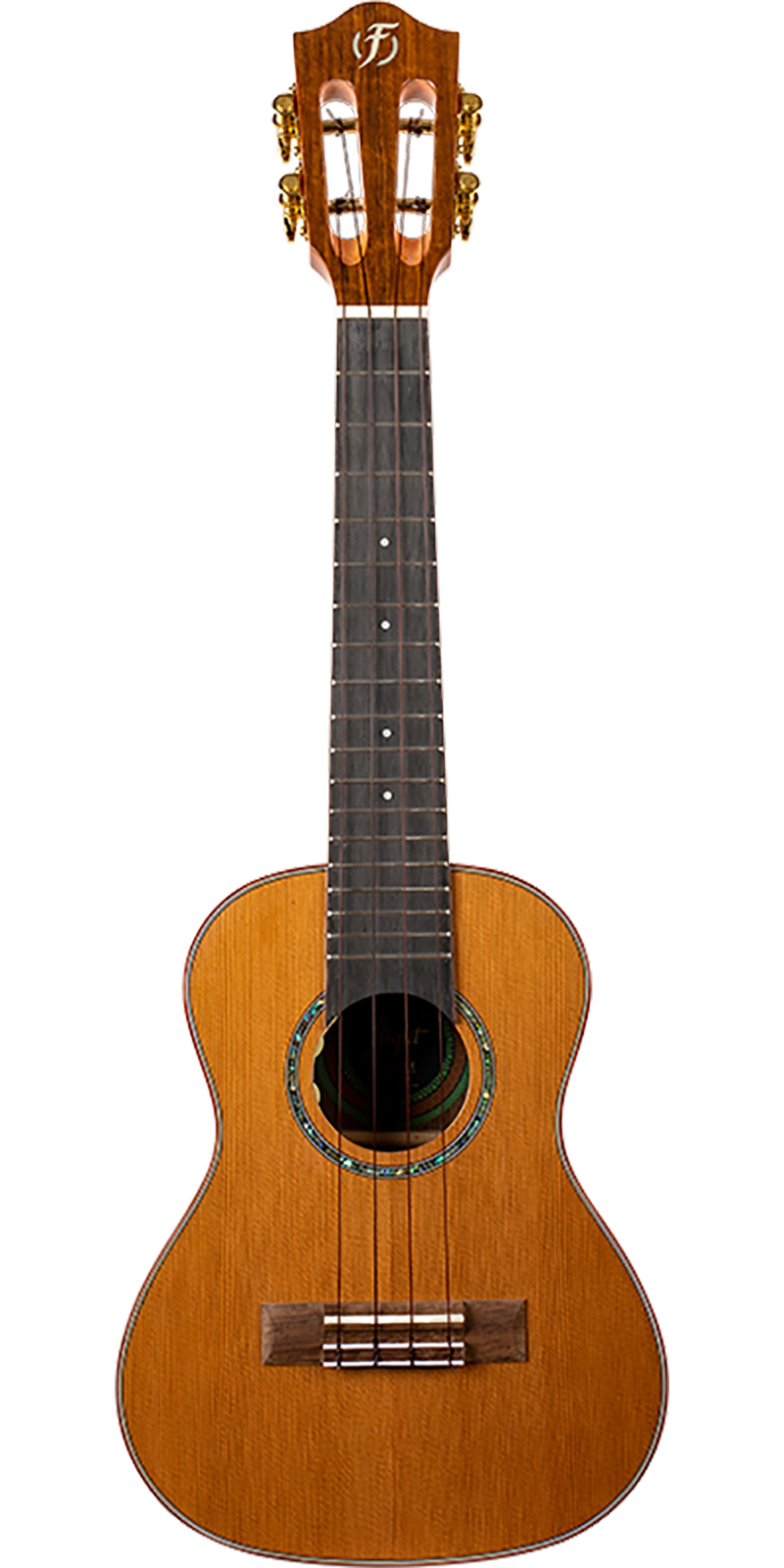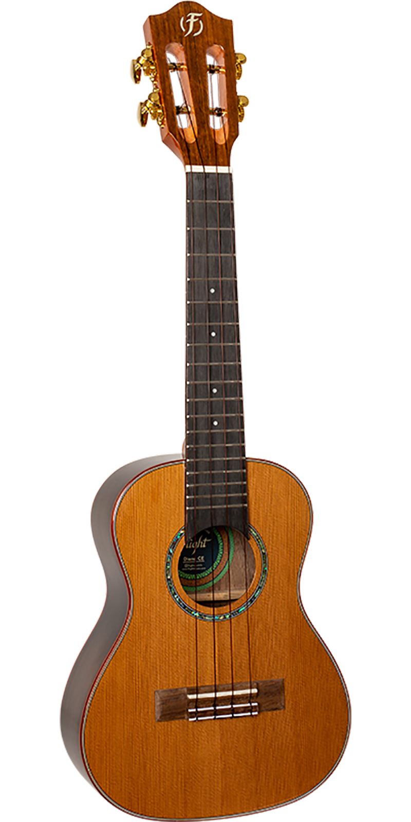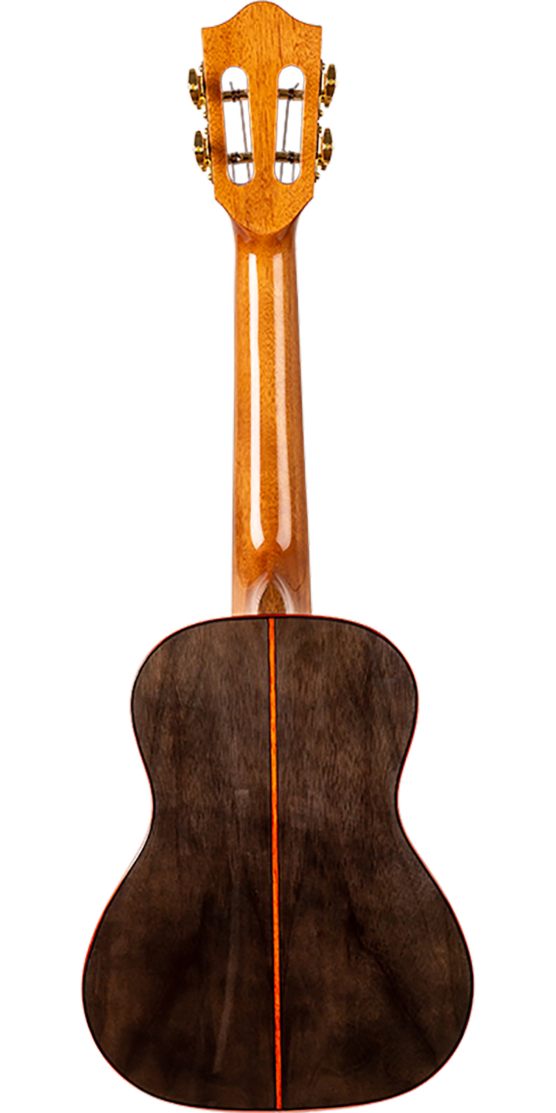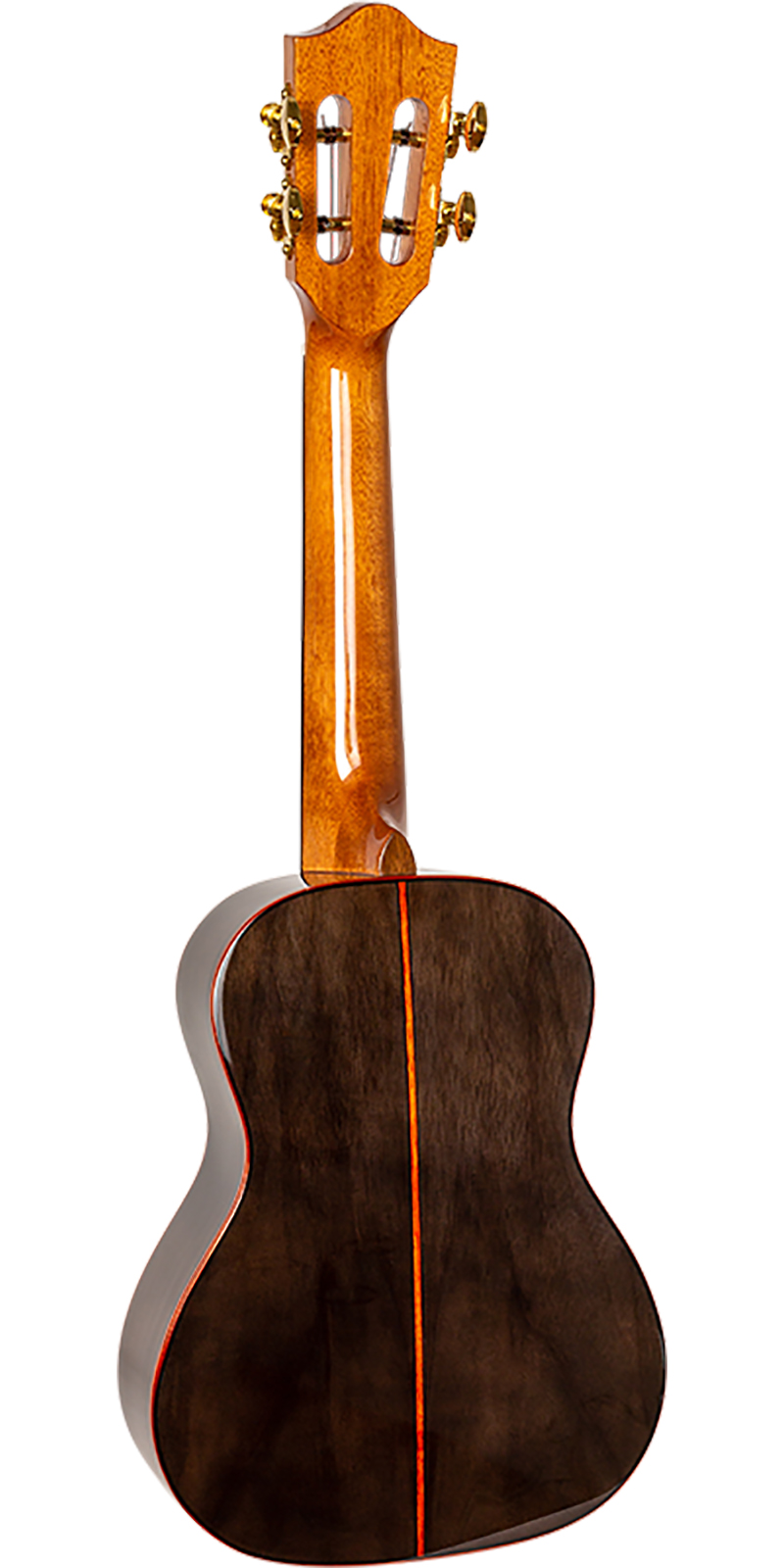 Cedro y nogal.El cedro es una madera de tono ukelele conocida por su brillante claridad y volumen. Junto con la tapa de cedro completamente sólida, hay una hermosa madera de nogal laminado para agregar un aspecto más oscuro y un sonido similar al del palo de rosa. El emparejamiento de las dos maderas proporciona una profundidad inigualable de tono. Para hacer las cosas aún más celestiales a la hermosa mancha profunda del nogal es un brillo para todo el cuerpo el que hace que este ukelele sea realmente impresionante.