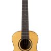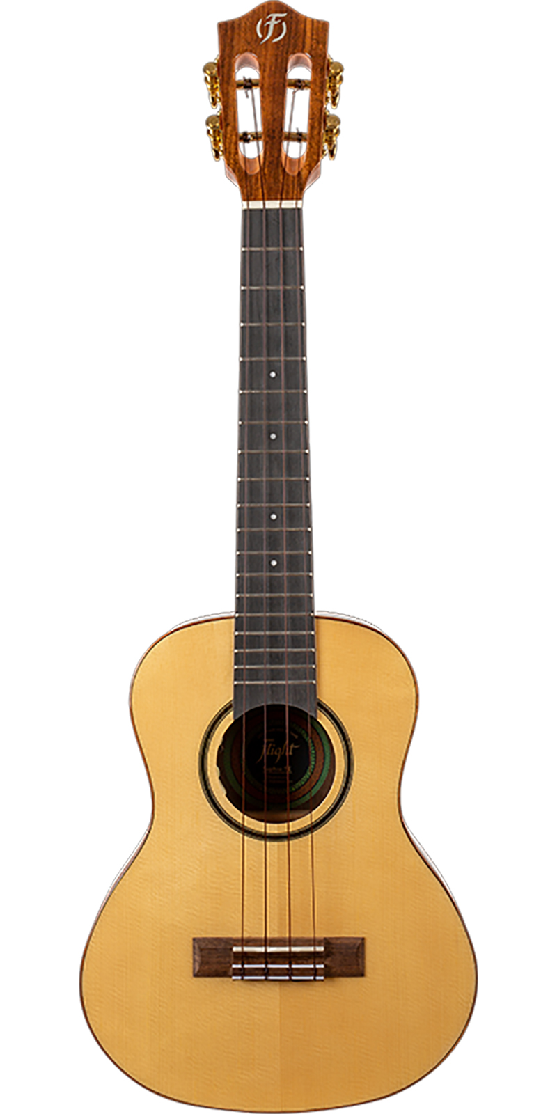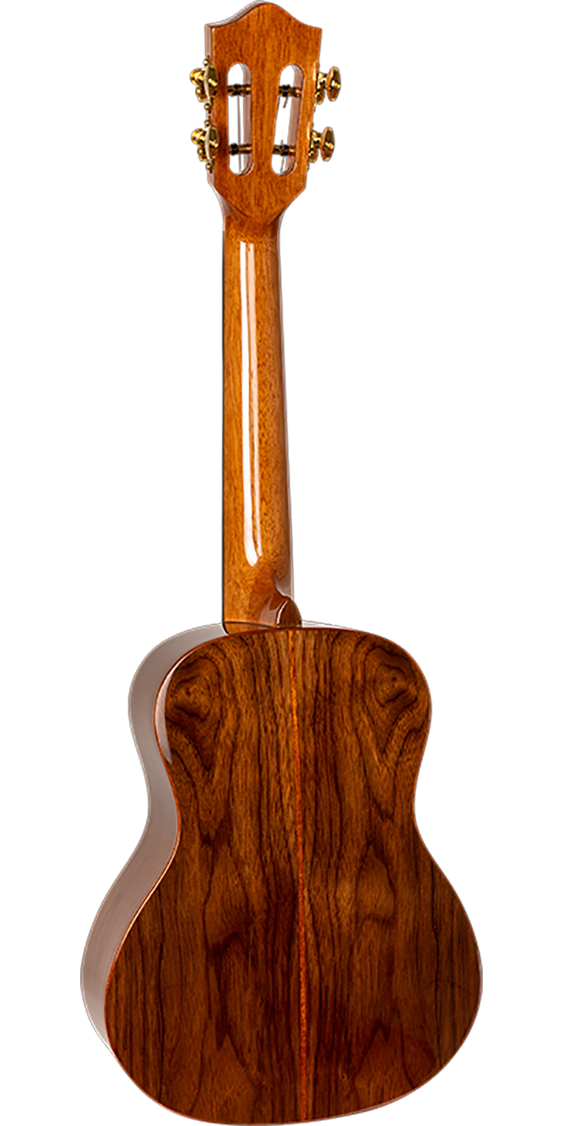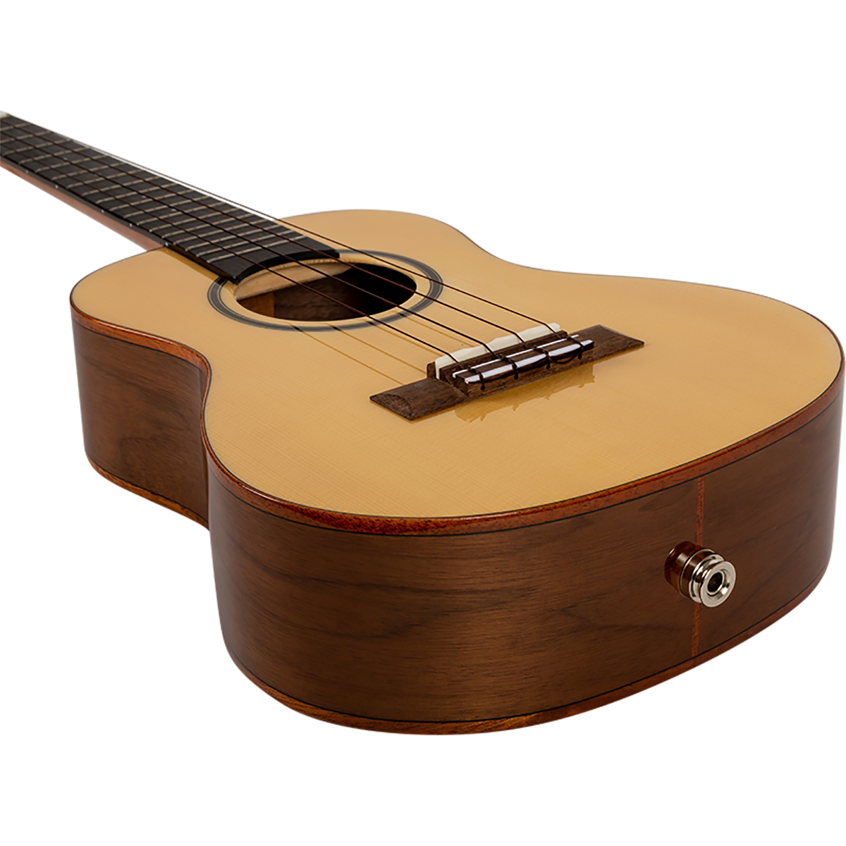 Abeto y nogal.El abeto es una madera adorada por quienes tocan el ukelele debido a su proyección abierta y su volumen. Esta tapa de abeto completamente sólida se combina con una hermosa madera laminada de nogal para agregar un aspecto más cálido y un sonido similar al del palo de rosa. La unión de estas dos maderas proporciona un tono profundo y una resonancia impresionante. Justo cuando pensabas que no podría ser más celestial con el magnífico contraste de las dos maderas, el brillo de todo el cuerpo hace que este ukelele sea un verdadero afinador.
