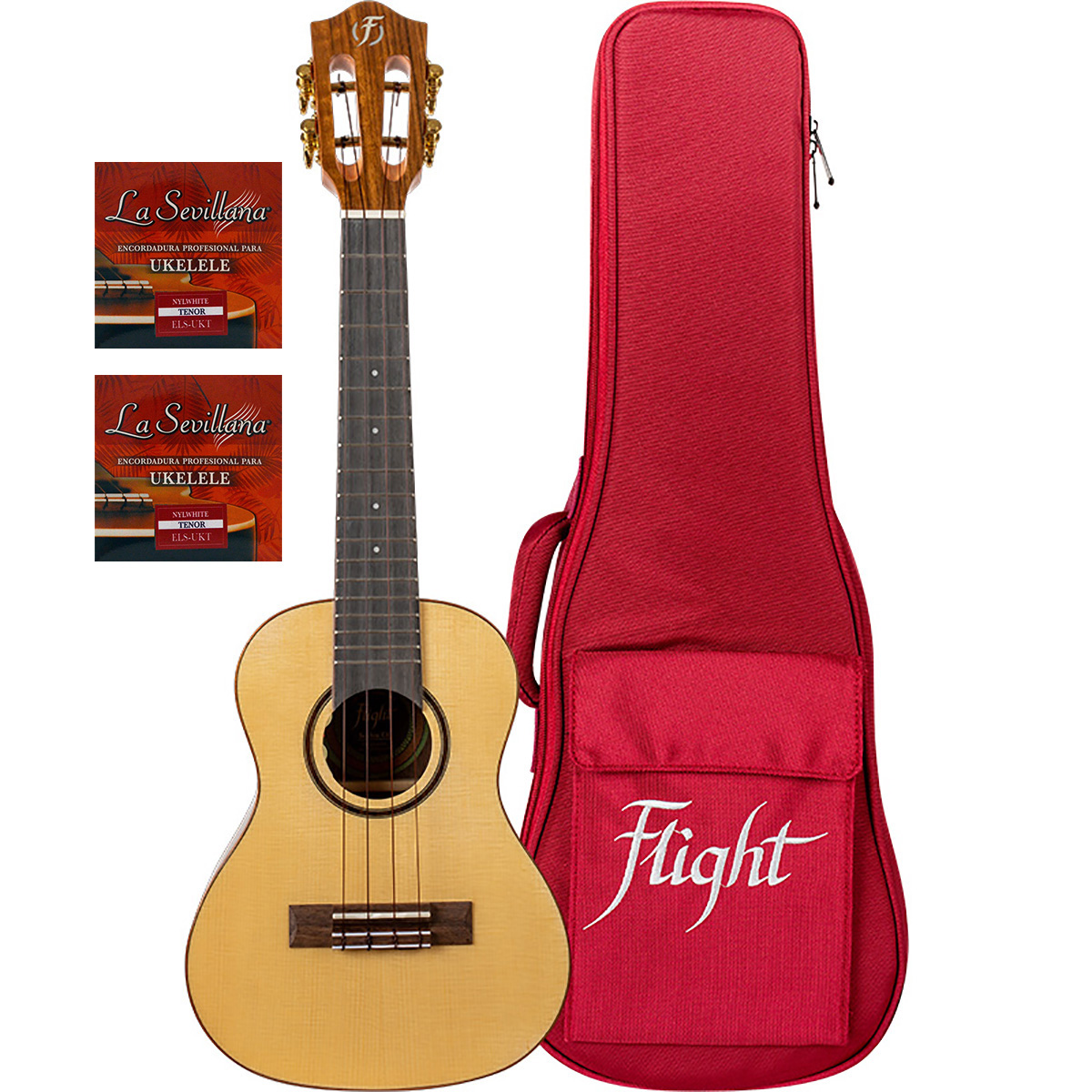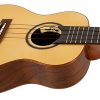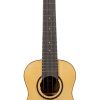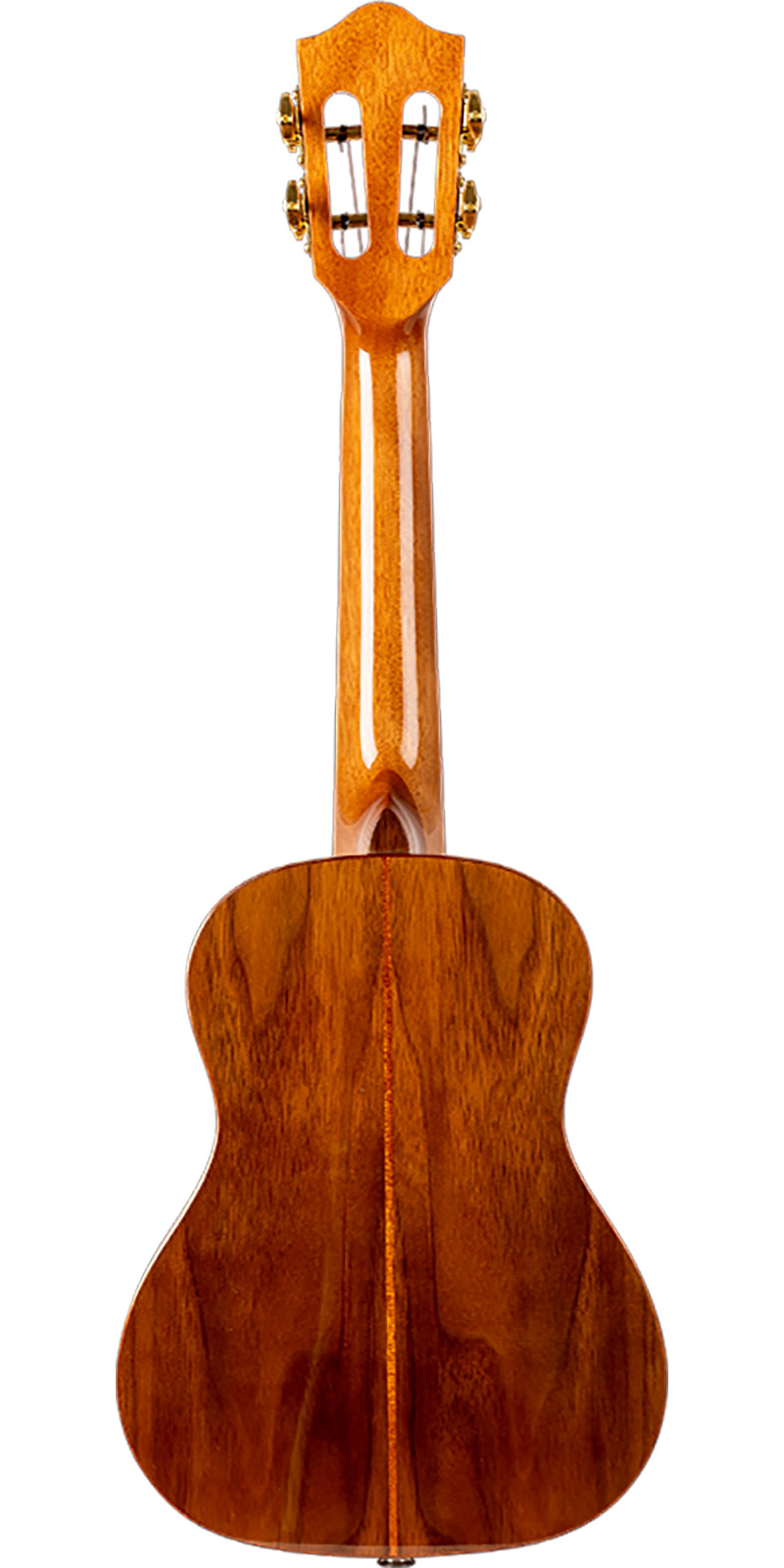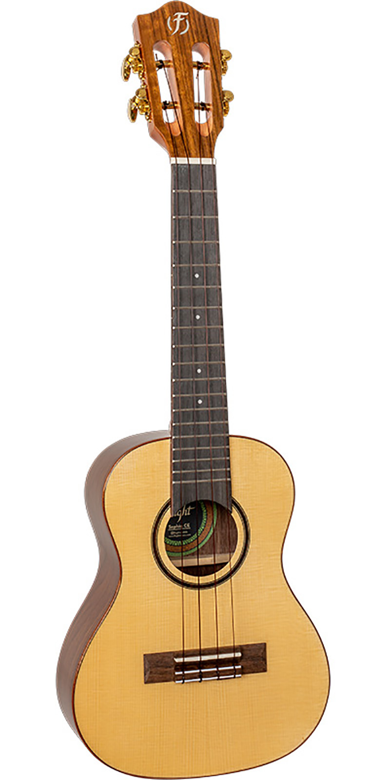 Abeto y nogal.El abeto es una madera adorada por quienes tocan el ukelele debido a su proyección abierta y su volumen. Esta tapa de abeto completamente sólida se combina con una hermosa madera laminada de nogal para agregar un aspecto más cálido y un sonido similar al del palo de rosa. La unión de estas dos maderas proporciona un tono profundo y una resonancia impresionante. Justo cuando pensabas que no podría ser más celestial con el magnífico contraste de las dos maderas, el brillo de todo el cuerpo hace que este ukelele sea un verdadero afinador.