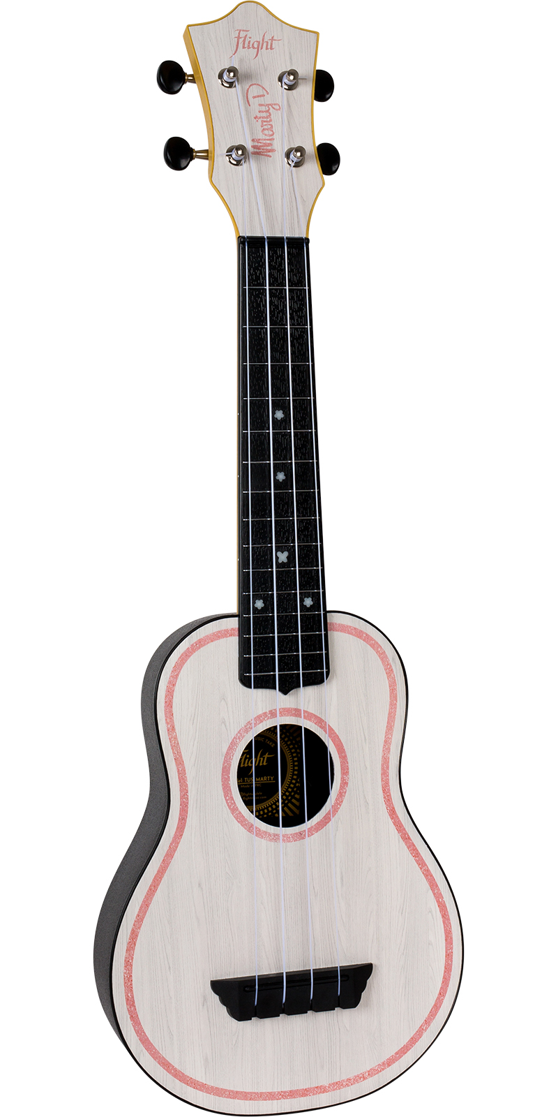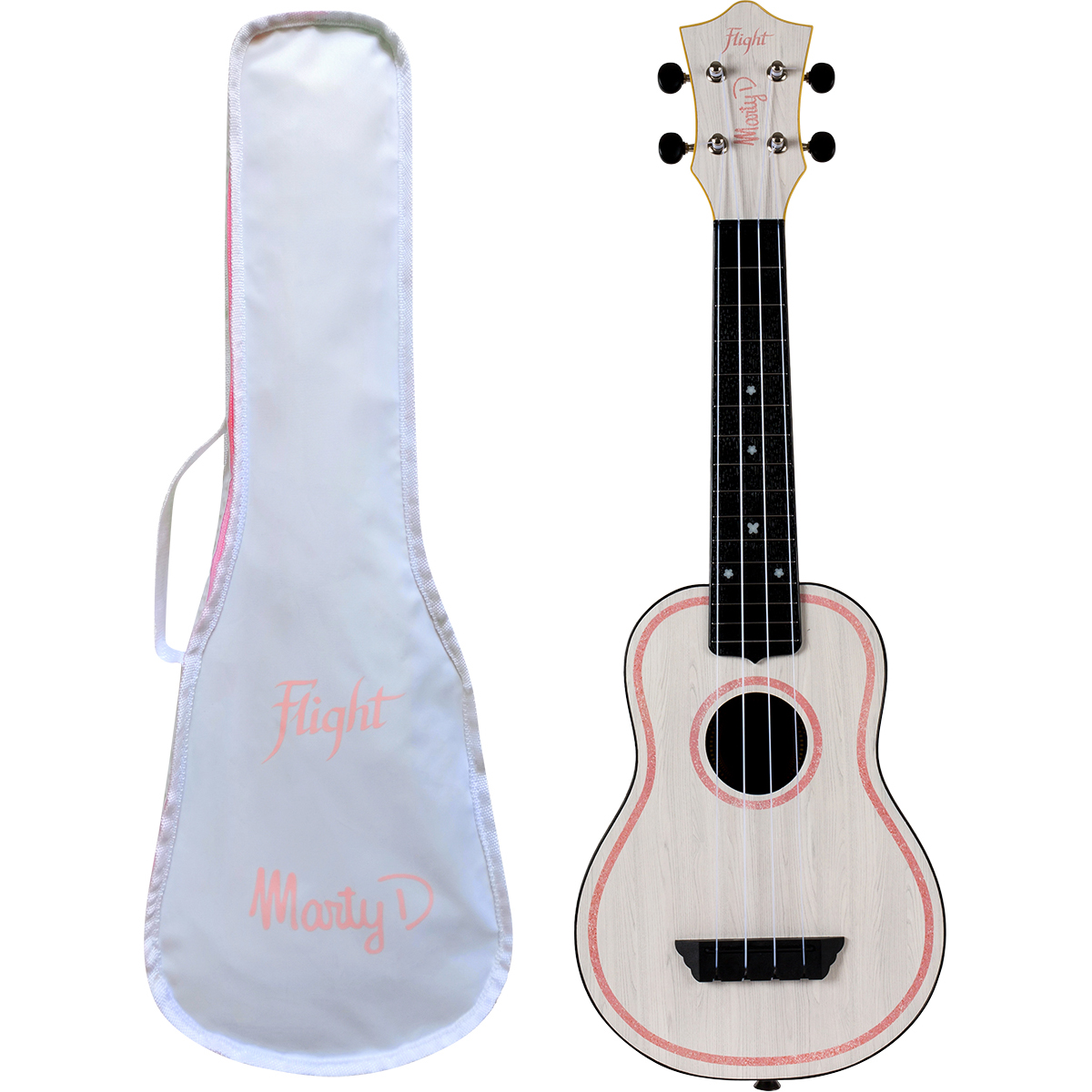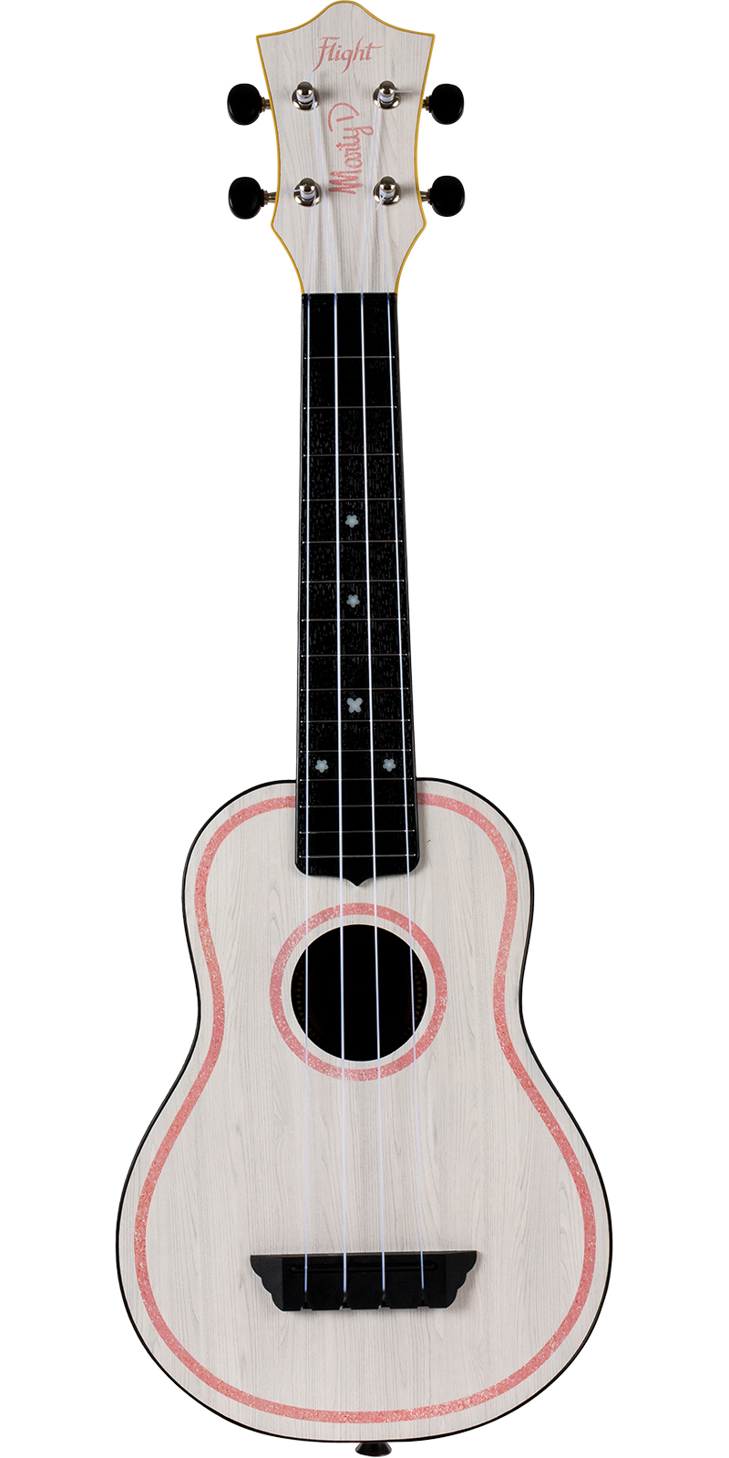 Siempre listo para el show.Todos los ukes Flight Travel cuentan con una funda de color azul denim, pero Marty, como una verdadera princesa, quería una diferente, muy linda de color blanco con ribete rosa.