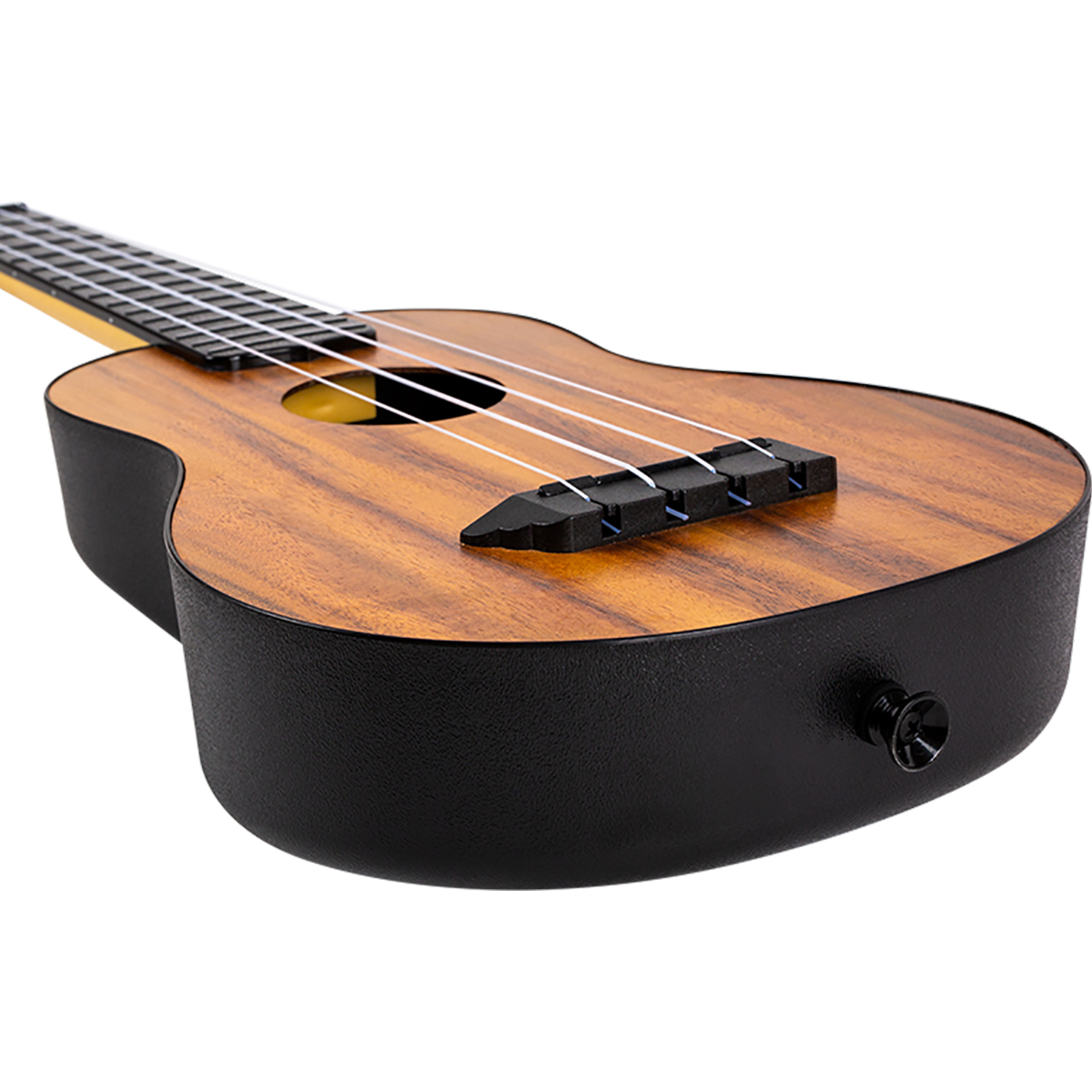 El brazo y el diapasón de este ukelele están hechos de plástico ABS. Esta es una solución perfecta para los ukeleles de primera clase, ya que no es propenso a los cambios climáticos. Nunca experimentarás un traste agudo o un brazo doblado en nuestros ukeleles Travel. El brazo tiene una textura de madera que ayuda a que el instrumento se sienta diferente a un ukelele de plástico mientras lo tocas.