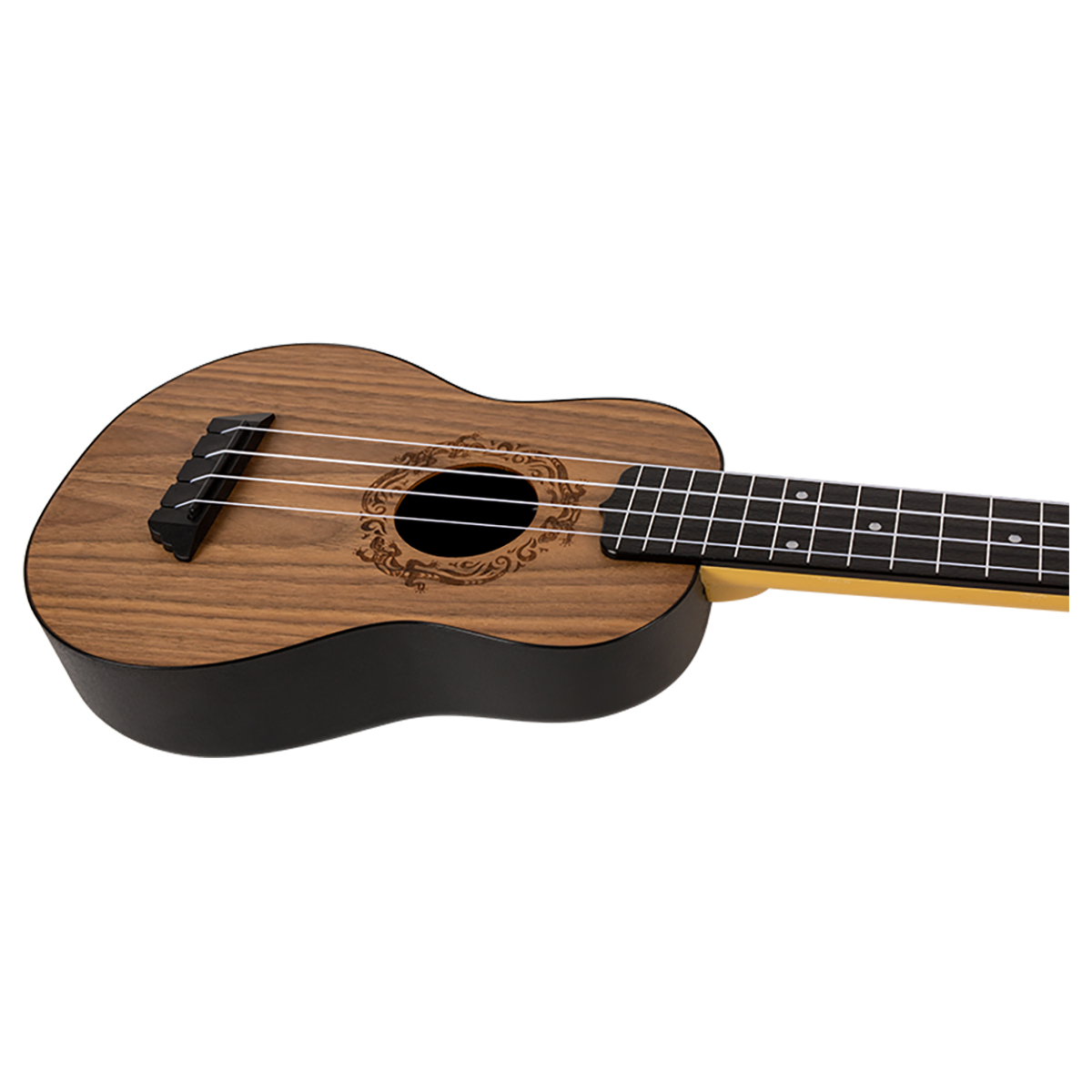 El brazo y el diapasón están hechos de plástico ABS. Es una solución perfecta para los ukeleles para principiantes, ya que no es susceptible a ningún cambio en el ambiente (humedad, sequedad, etc.). Nunca verás un traste movido o un brazo doblado en nuestra gama Travel de ukeleles. La superficie del brazo imita los patrones de la madera, evitando así la sensación de tocar con plástico.
