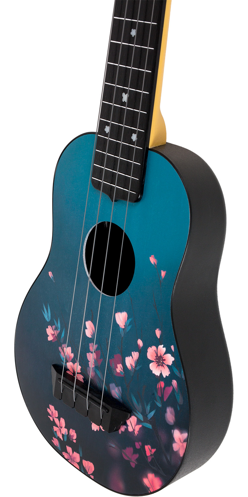 El brazo y el diapasón están hechos de plástico ABS. Es una solución perfecta para ukeleles de primera clase, ya que no es propenso a ningún cambio climático. Nunca obtendrás un traste afilado o un brazo doblado en ninguno de nuestros ukeleles Travel. La superficie del brazo imita el patrón de madera para evitar una sensación de plástico barato.